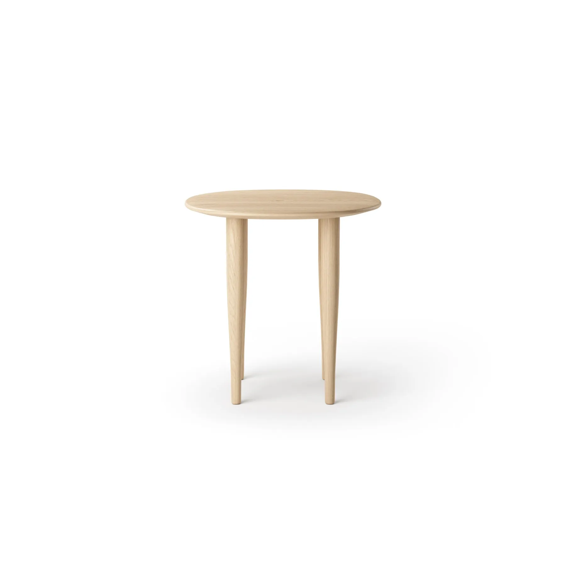 The tables are shaped as organic circles or ellipses with rounded soft edges for a smooth touch. The legs have narrowing profiles for a floating appearance.