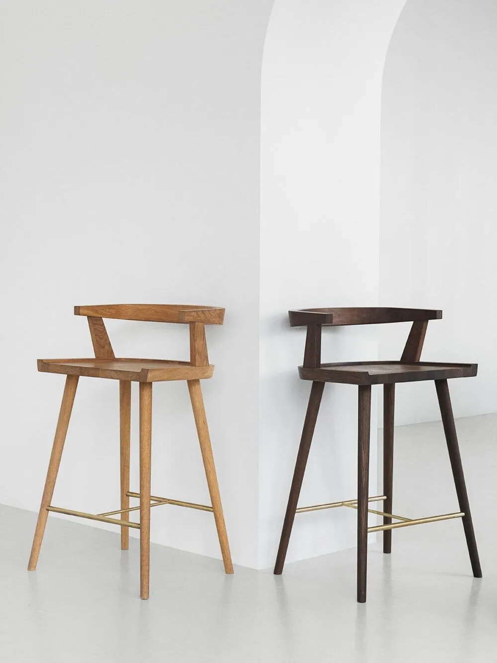 KBH High Chair is made of solid oak with brass details and designed for casual seating by a bar or a kitchen island and is therefore available in 2 different heights. 67 and 75 cm. The chair is also available in two colours; natural oak and medium fumed oak and can be matched with a cushion in soft nubuck (choose between 6 colours). Chairs and cushions are handmade in Denmark.