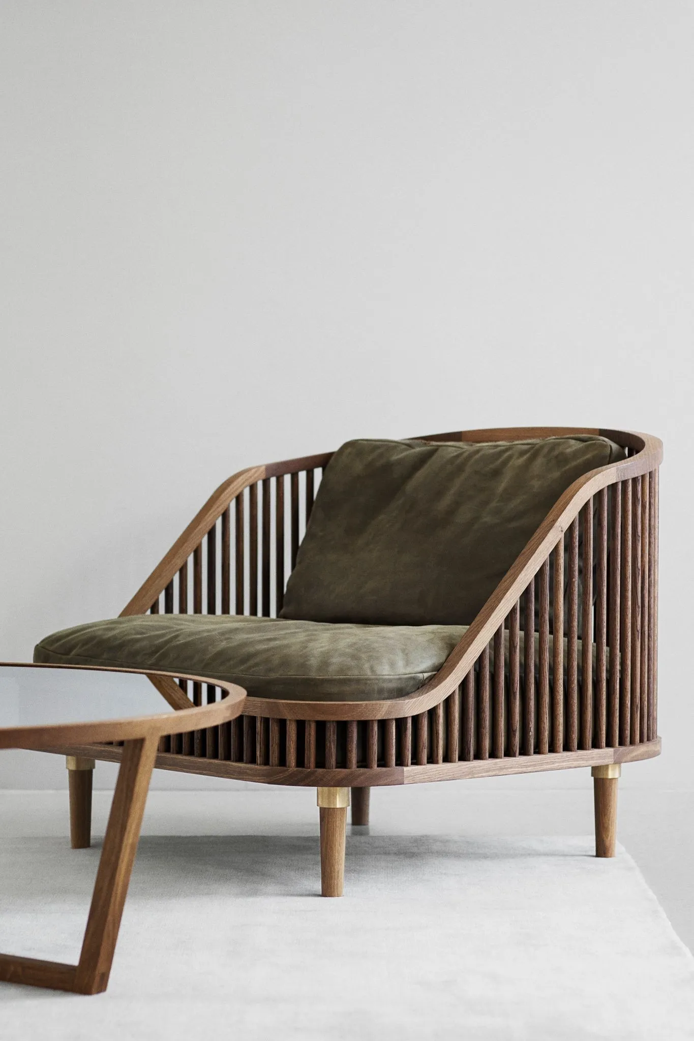 KBH Lounge Chair is a modern design that brings together a blend of Danish, Italian and Japanese joinery and aesthetics. The chair comes in medium fumed oak with different types of upholstery fabric that ensures a soft, tactile feel. Brass details complete the design. The chair is handmade in Denmark.