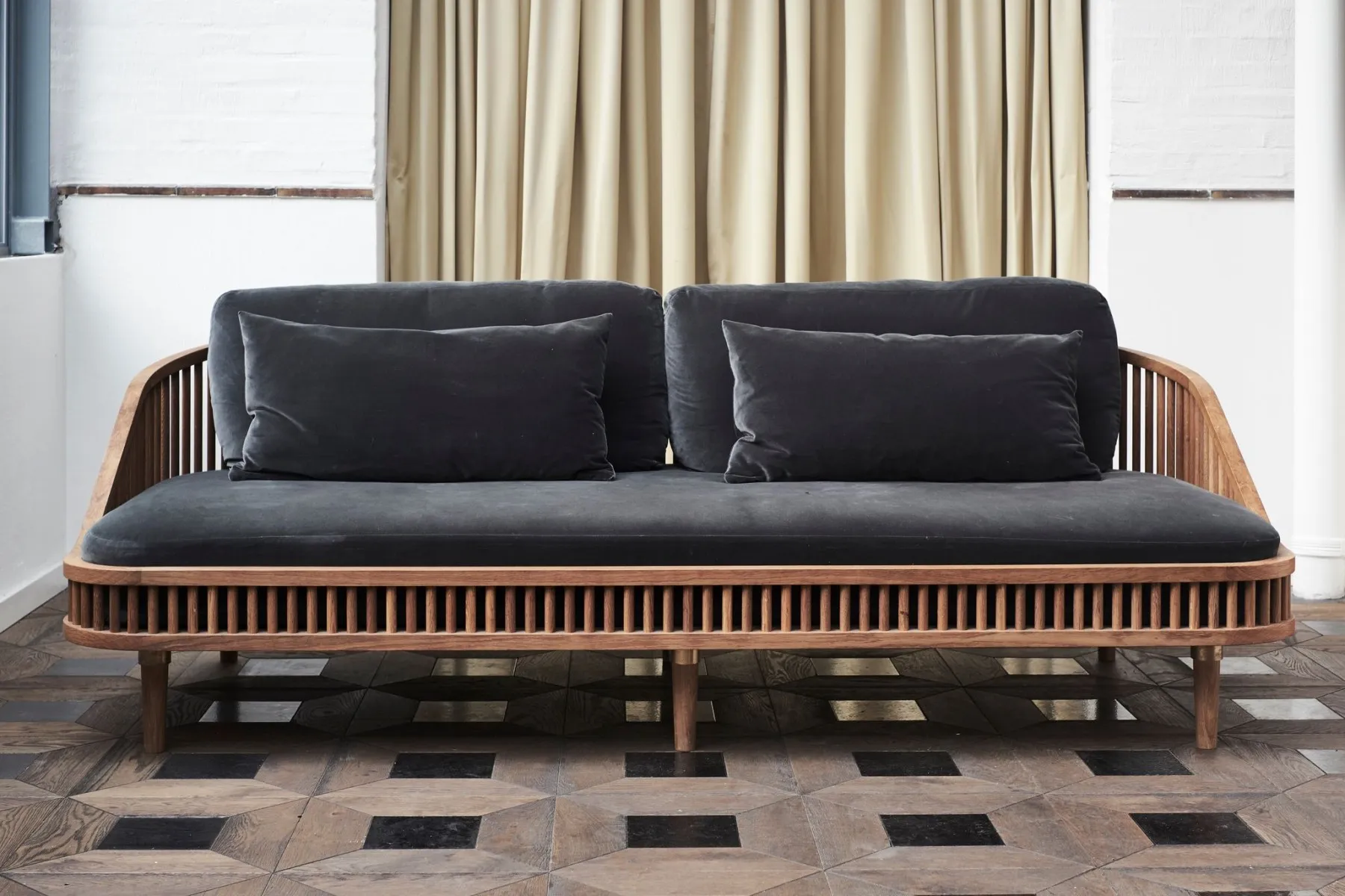KBH Sofa is a modern sofa design that brings together a blend of Danish, Italian and Japanese joinery and aesthetics. The sofa comes in medium fumed oak with different types of upholstery fabric that ensures a soft, tactile feel. Brass details complete the design. The sofa is handmade in Denmark.