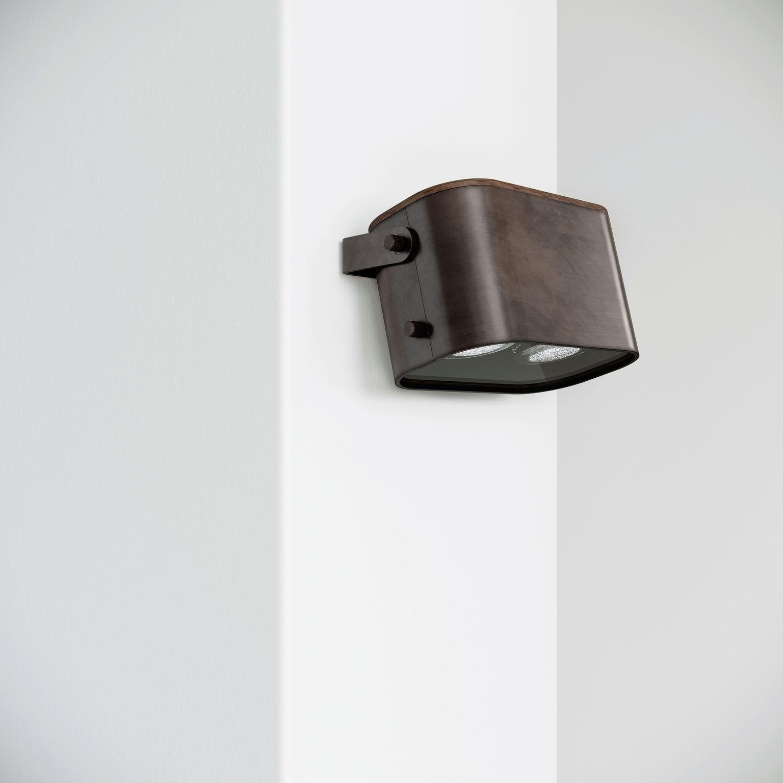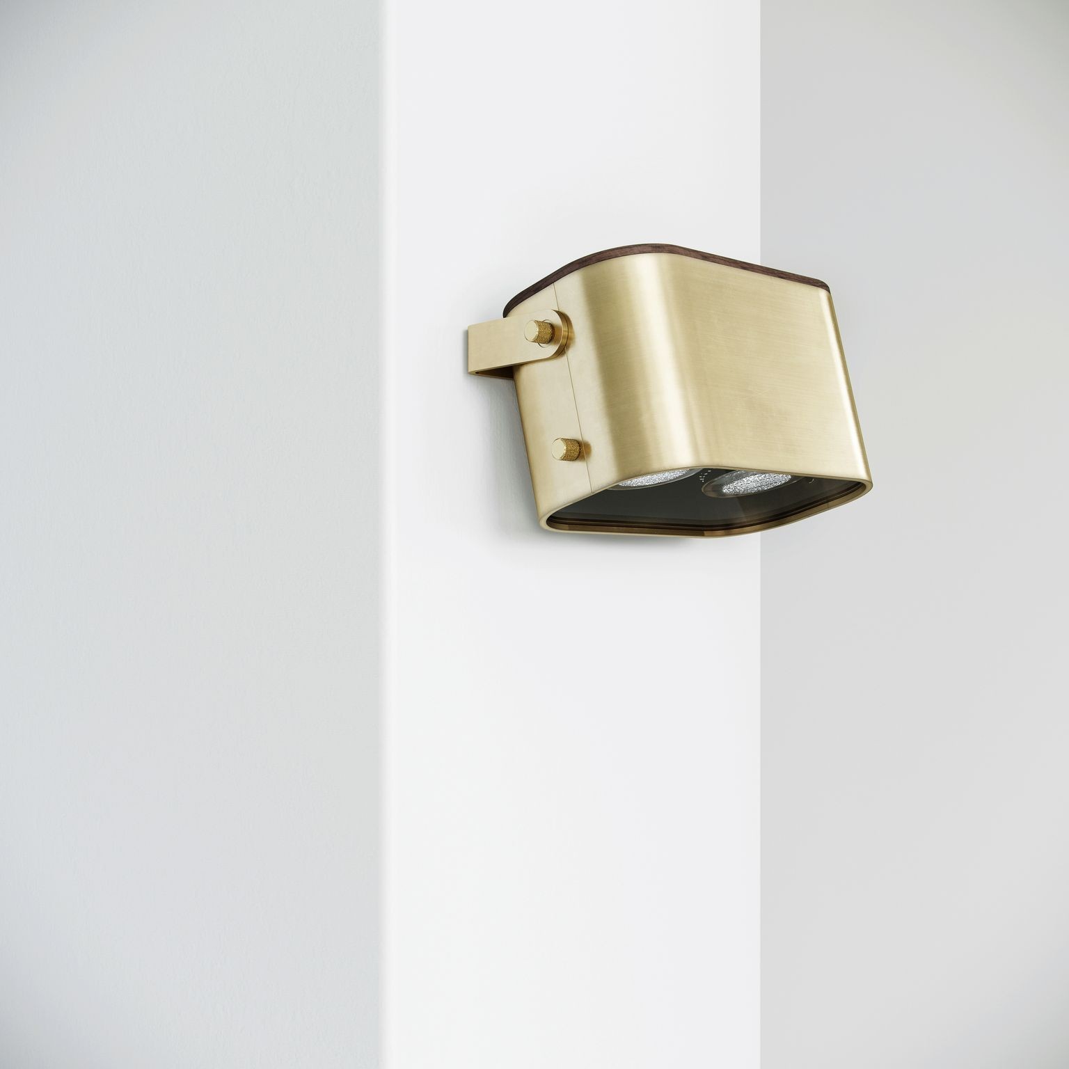 KBH Spot Wall can be wall or ceiling mounted with various angle options. The spot is made of solid brass or dark brass and has two LED light bulbs and a thick smoked glass. The spot is handmade in Denmark.