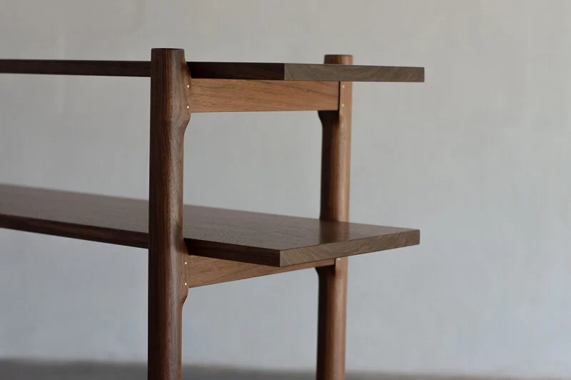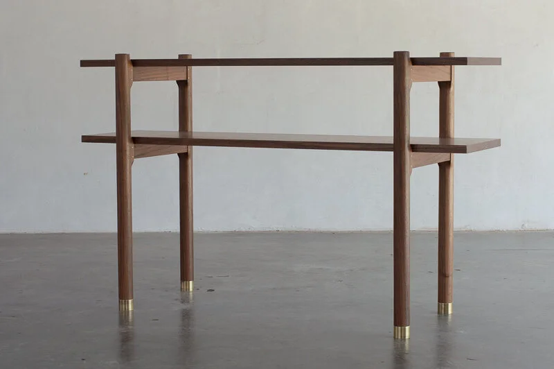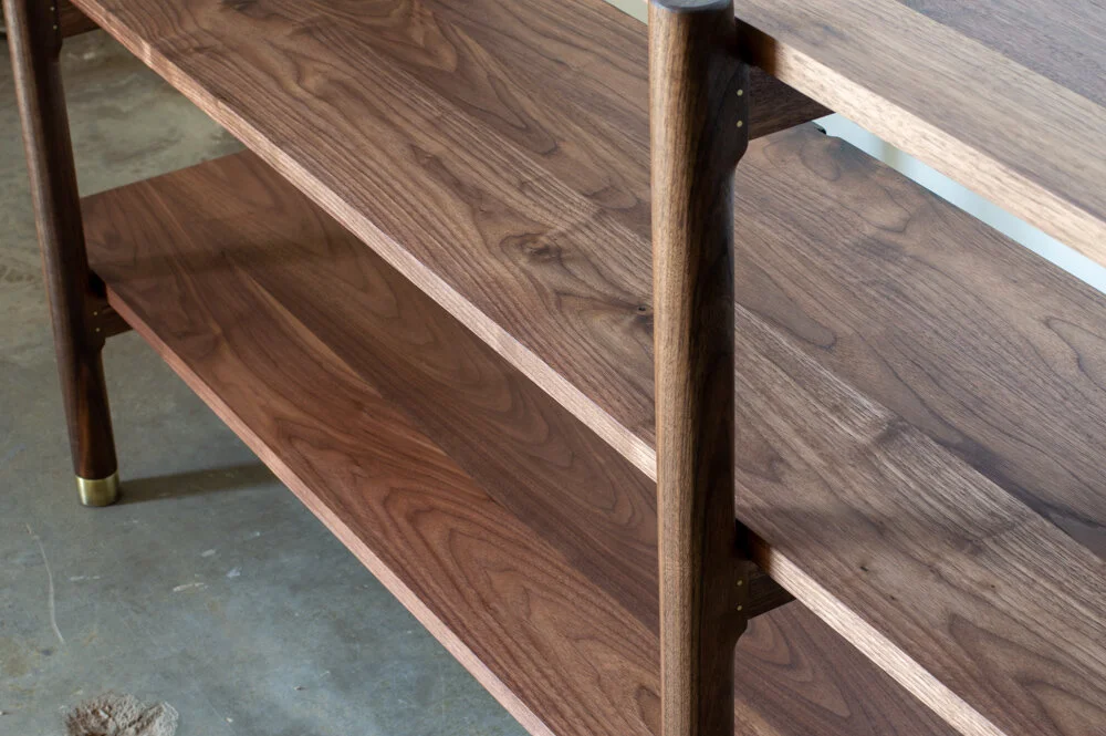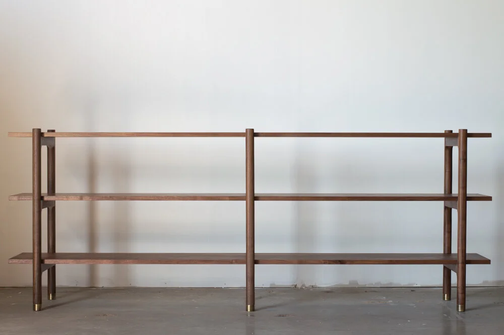 Crafted from solid wood, this shelf combines timeless elegance with refined craftsmanship. Thoughtfully designed, it features sand casted bronze accents that beautifully complement the rich tones of the wood. Every detail, from the sturdy shelves to the precision joinery, reflects a dedication to quality and longevity. Both functional and artful, this bookshelf serves as a sophisticated centerpiece, blending practicality with enduring style.