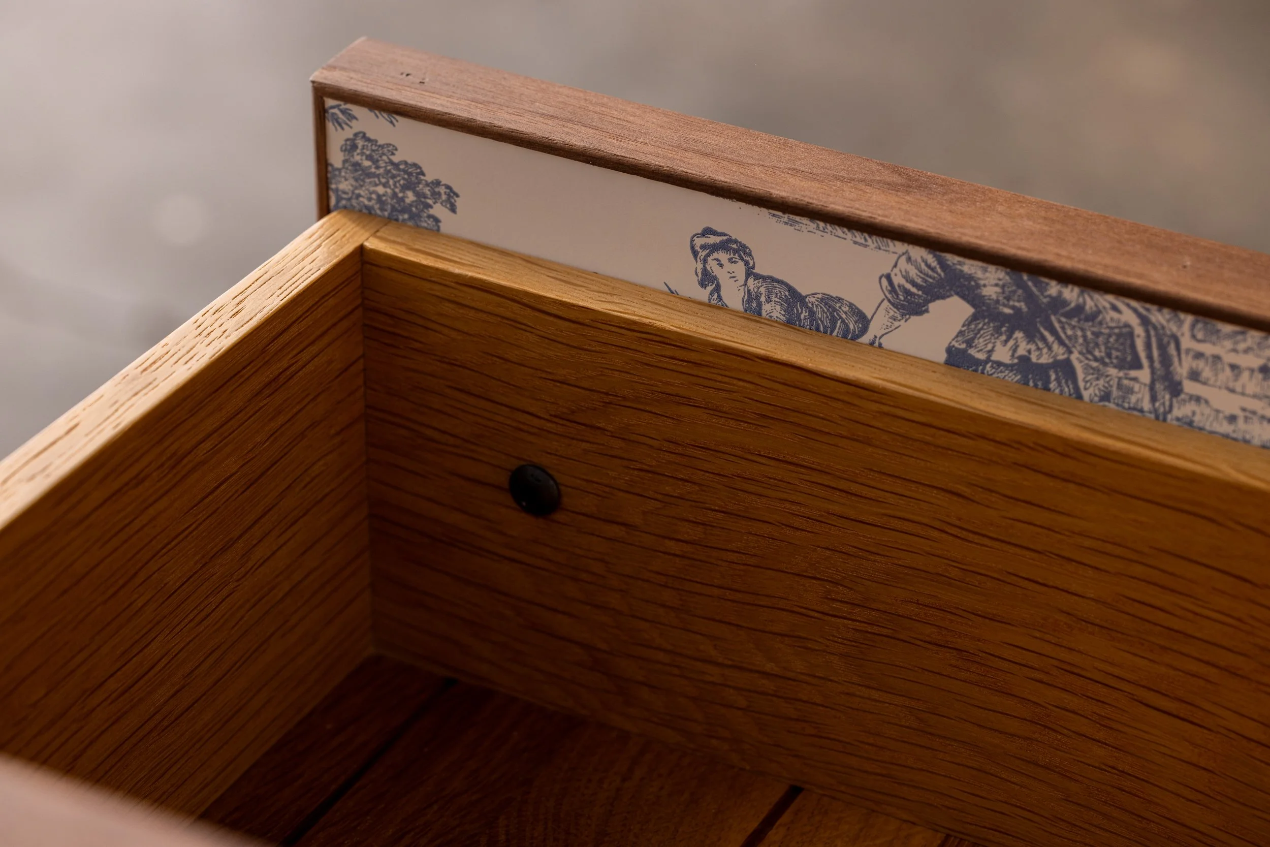 Oiled Walnut, Oiled White Oak, Fumed White Oak, Curly Maple, Bleached Maple, Bleached AshVenetian Plaster: Off Black, Off White, Dark Blue, Olive Green, Marigold Yellow, Blush Pink (Custom Colors Available)Wallpaper: Chinoiserie or COMHardware available in Light Aged Bronze or Dark Aged Bronze