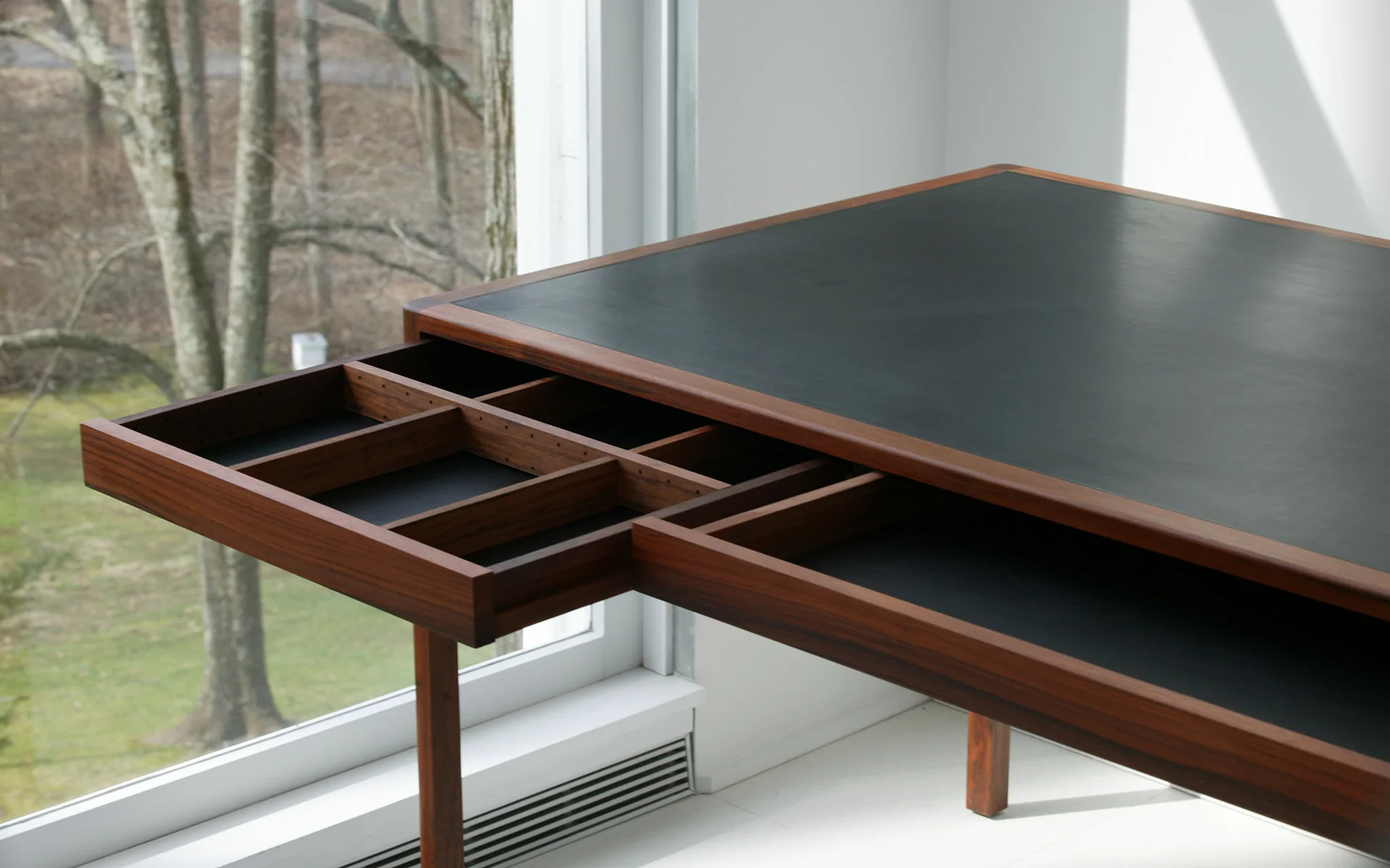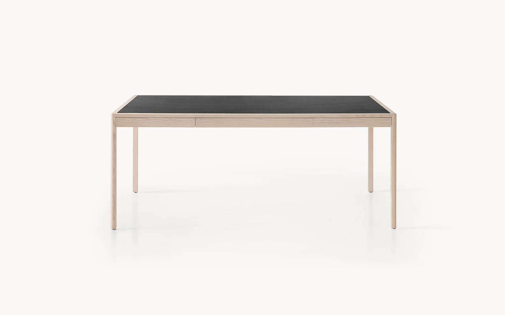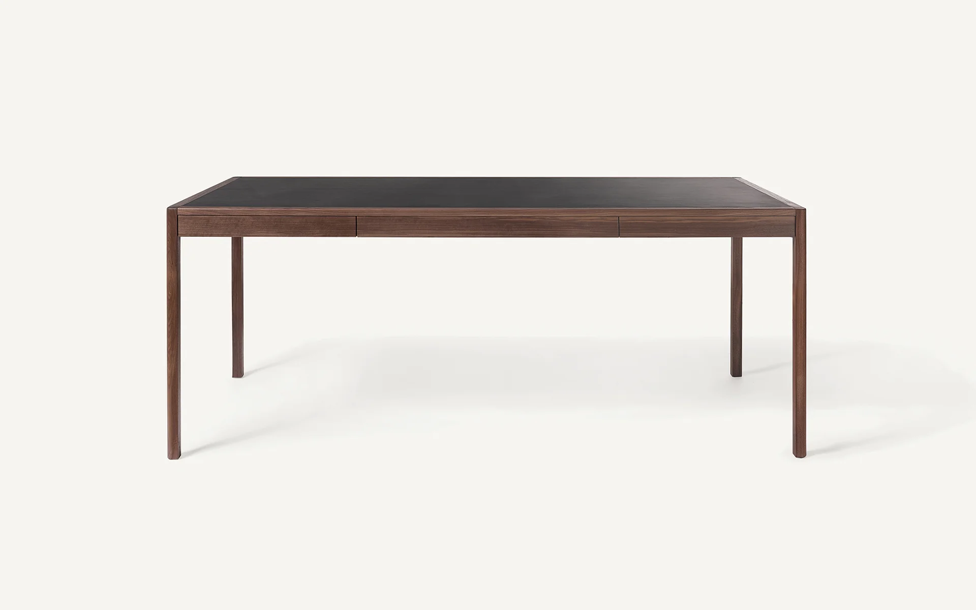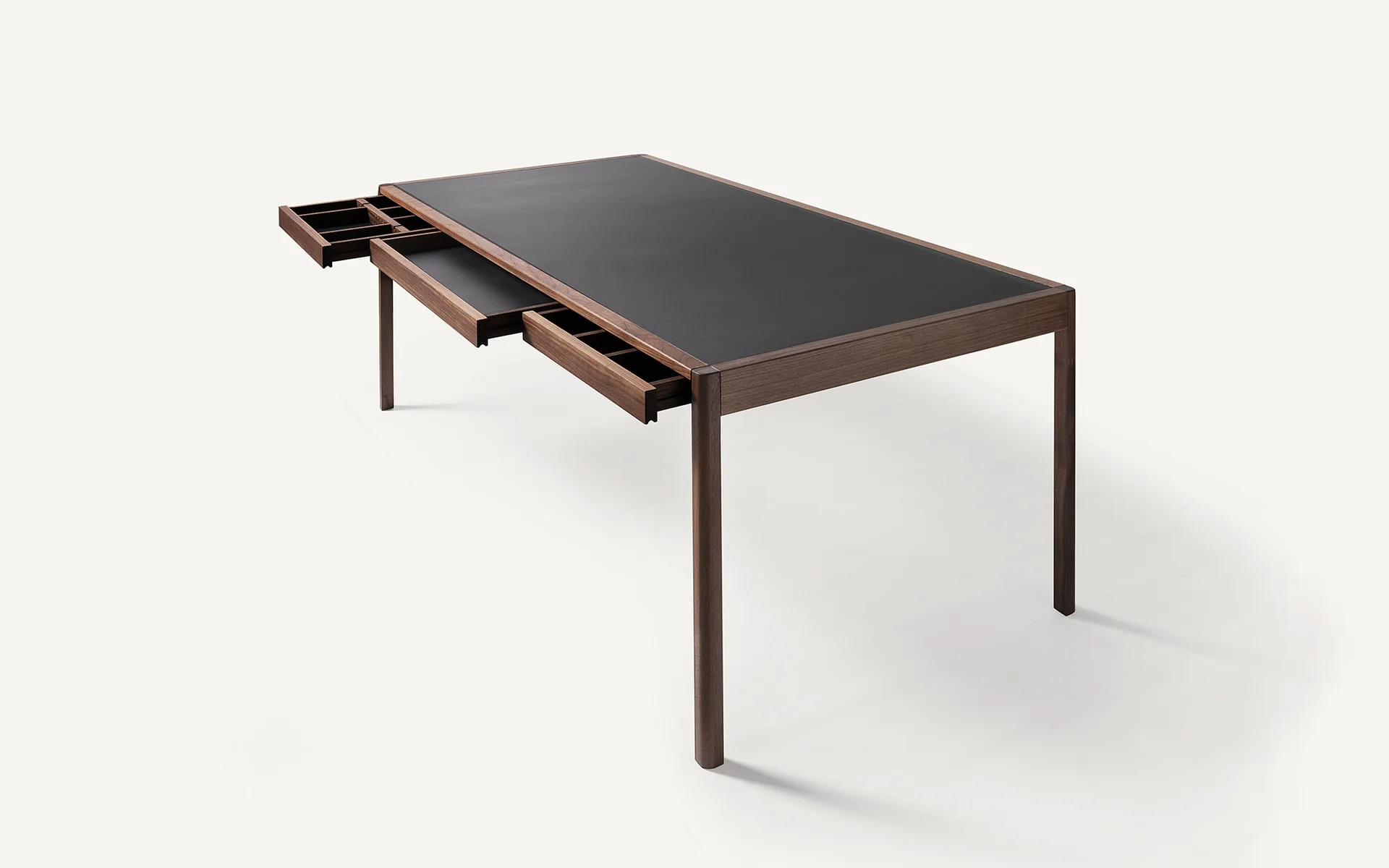 The writing desk is a classic furniture staple that marries beauty with functionality. Through proportion and engineering, BassamFellows has reimagined this time-honored piece, producing a sensuous status symbol for the ultimate sophisticate. Created in tandem with the BassamFellows Daybed, the Leather Desk is the ultimate expression of functional luxury. Structurally, the desk has a striking, slim silhouette, with each leg and corner joint dowelled eight times to provide strength despite the thin proportion. This creates a sense of levity, when contrasted against the desk’s solid wood construction. Legs, side members, and structural spans are reduced to their essence and carefully considered in relationship to each other. The absolute purity of form masks the true genius of the desk’s function. Three slim drawers, nearly imperceptible to the eye, are cut away from the structure allowing the user to keep the desktop clear when not in use.