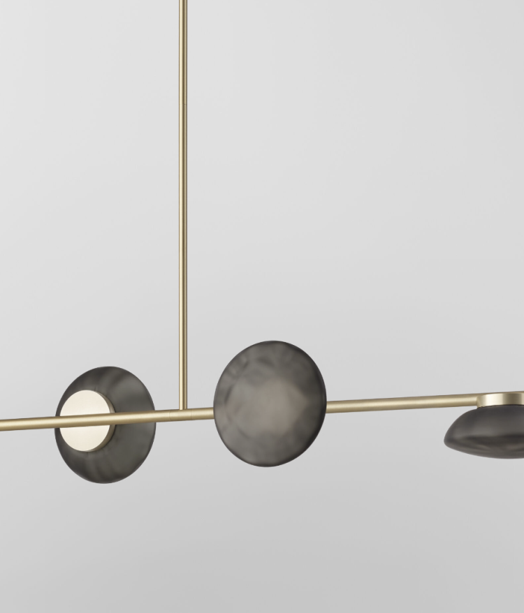 The Ceto Chandelier’s hand blown glass shades are available in four different finish options, each creating a unique light dispersion. Clear, White, Black, Frosted Black The body of the Ceto Chandelier is finished to either anodised champagne or anodised black.