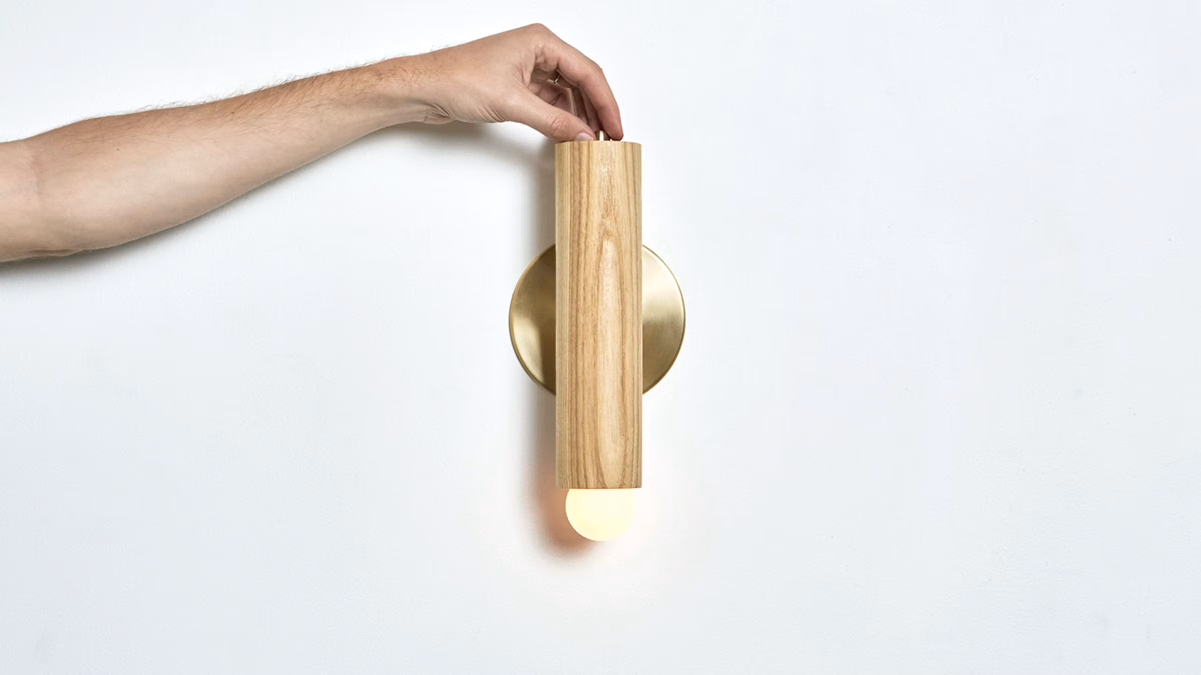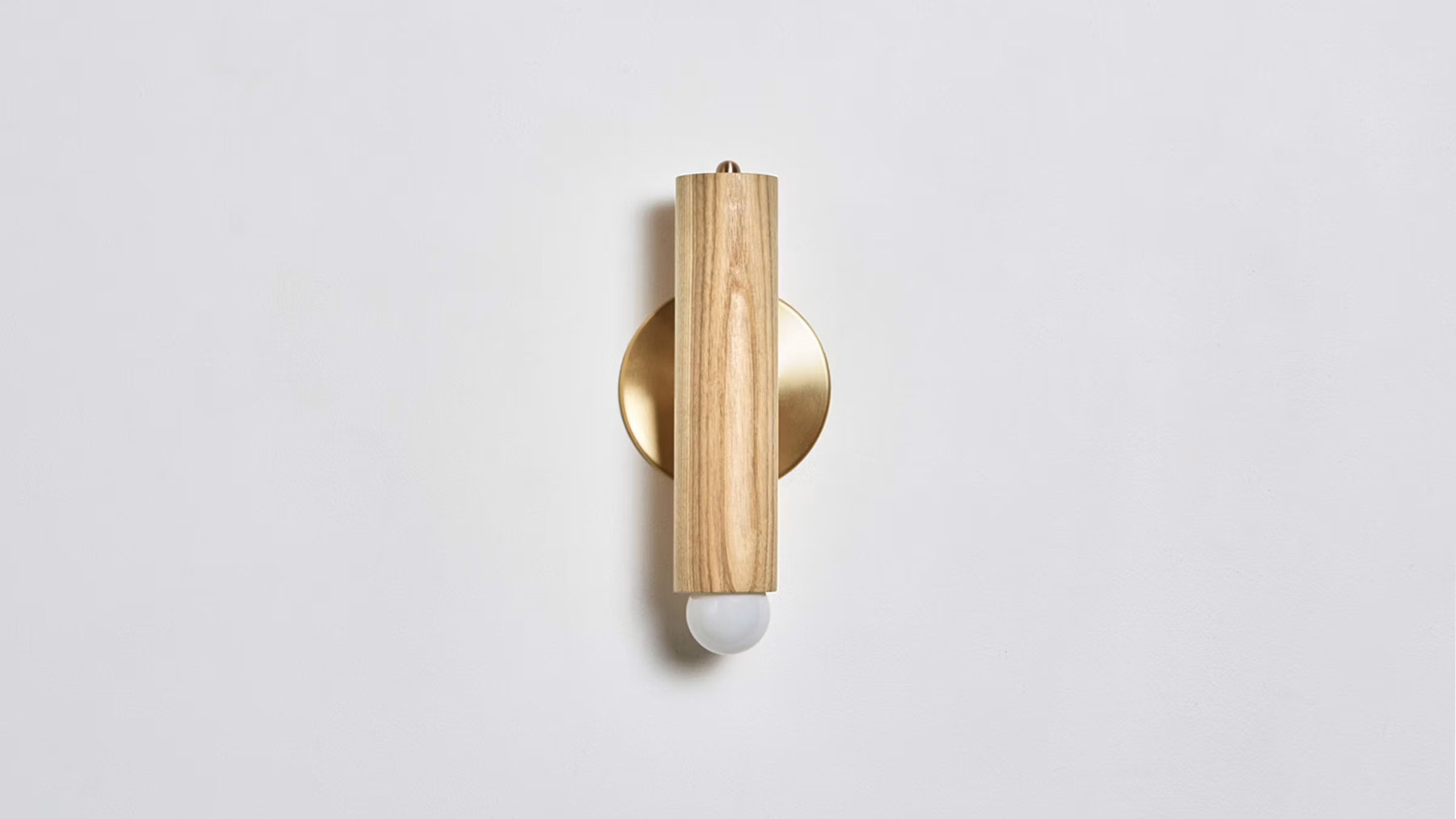 - The LODGE SCONCE features a singular wooden column mounted on a circular metal backplate. The adaptable fixture can pivot for soft directional light, dimmable by an on-fixture knob. Our natural oak is domestically sourced. Variations in tone, color, and grain pattern are part of the inherent beauty of this natural material. Made in the USA. UL Listed. Damp Rated.