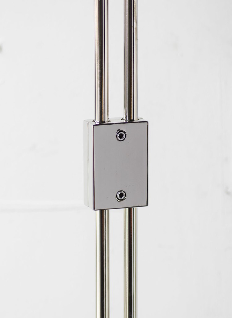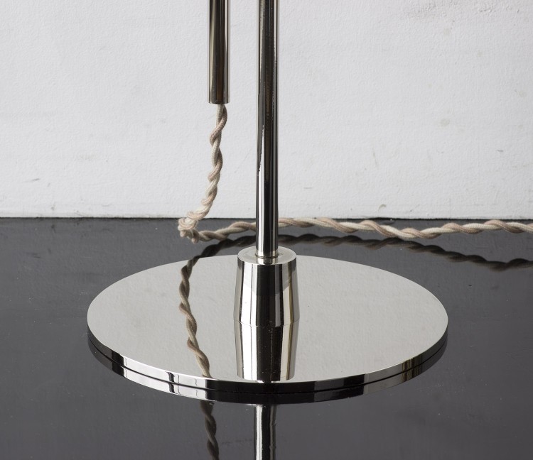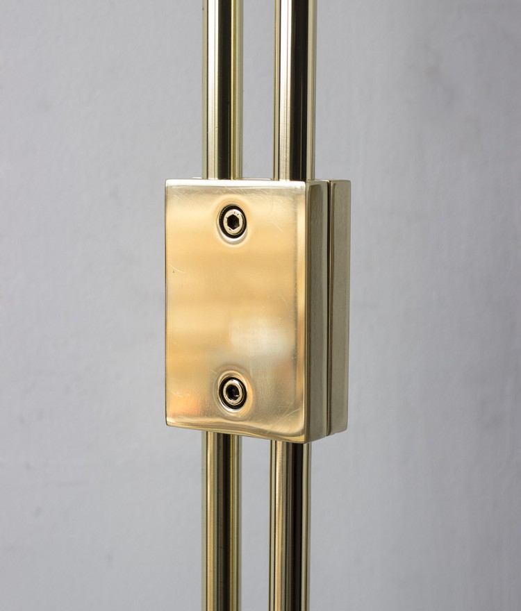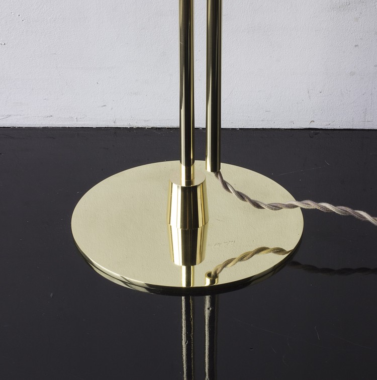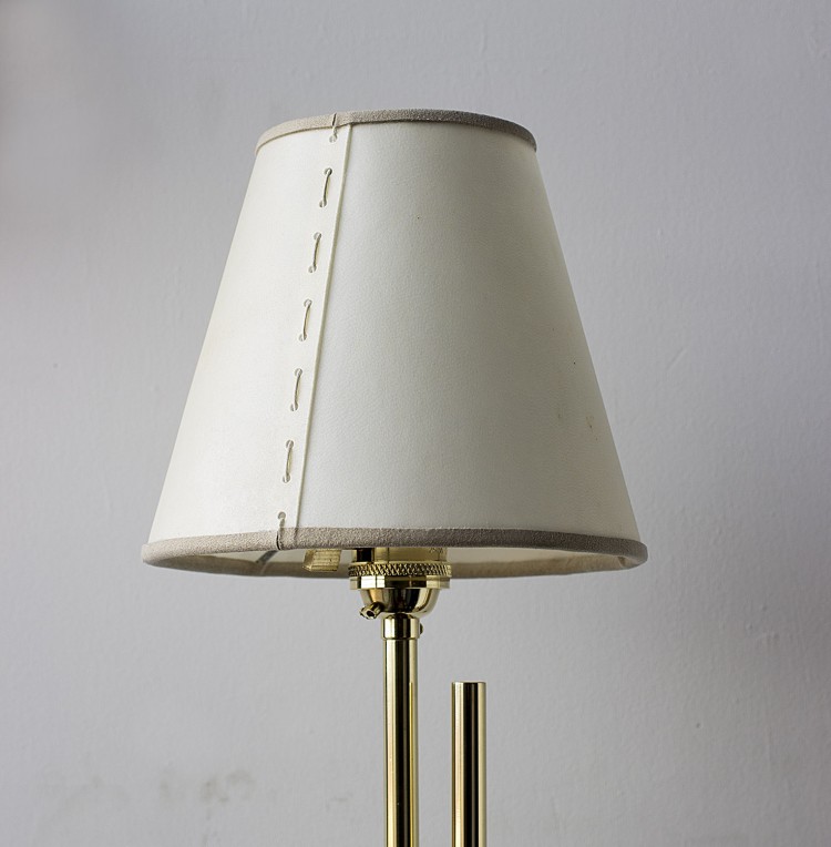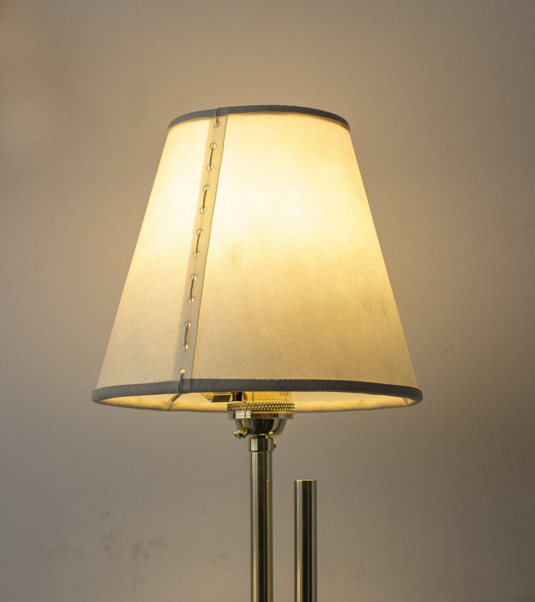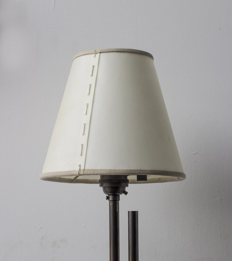 - Solid machined brass in polished unlacquered finish, goatskin parchment shade with ultrasuede trim, hand-dyed braided cotton cord. Adjustable height from 38"H to 63"H. Allen key included for loosening central clamping mechanism. - All material finishes are living finishes: they will change and patina for the better with time and use. Every product is individually had assembled; slight variations in color, size and shape are to be expected.