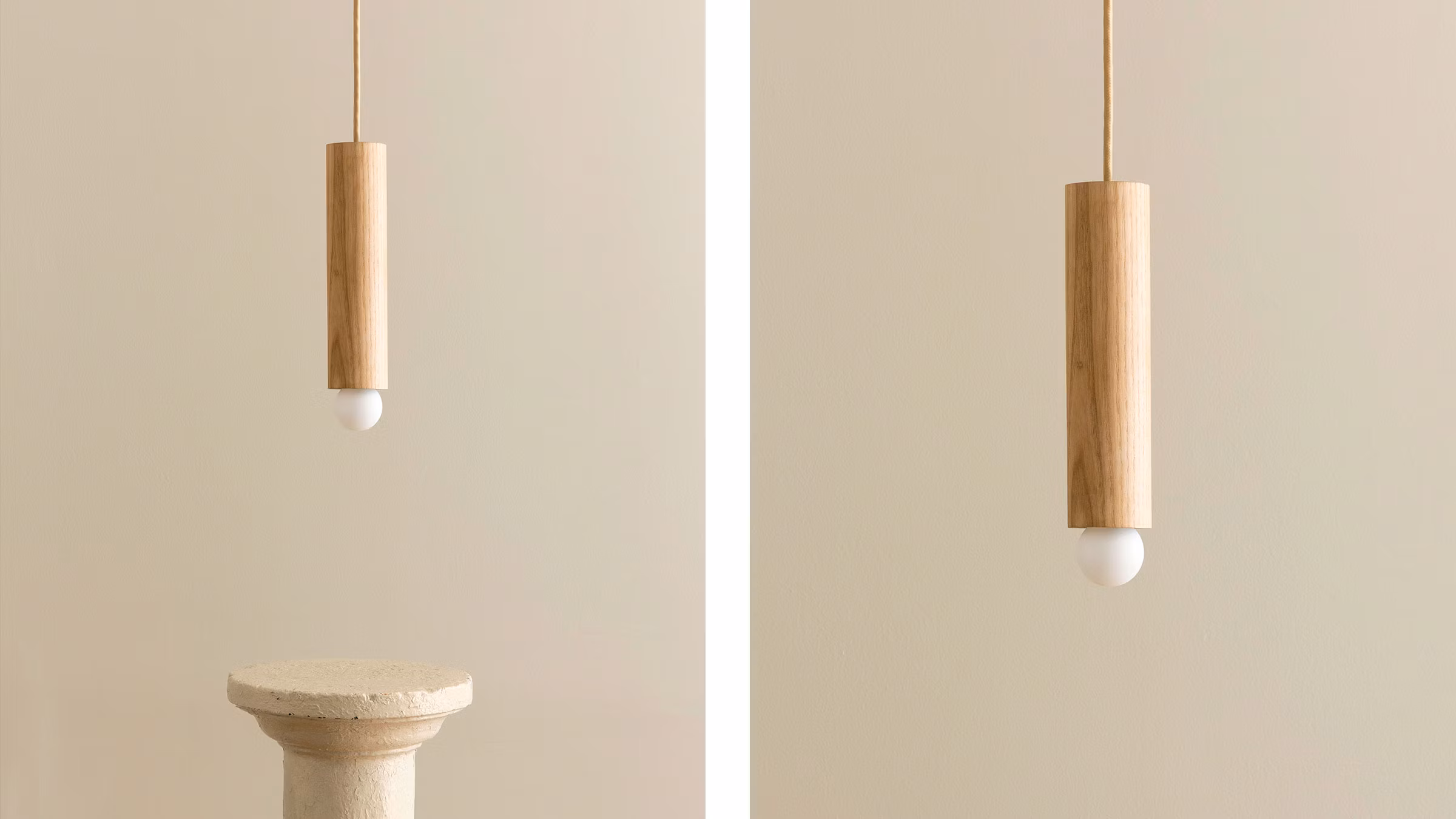 The LODGE CORD PENDANT SMALL is crafted from a hand-turned oak dowel. Suspended from a cloth cord, the wooden dowel is a tactile armature punctuated by a single glowing bulb. Available in Natural Oak or Oxidized Ash with Hewn Brass or Blackened Brass details. UL Listed. Damp Rated.