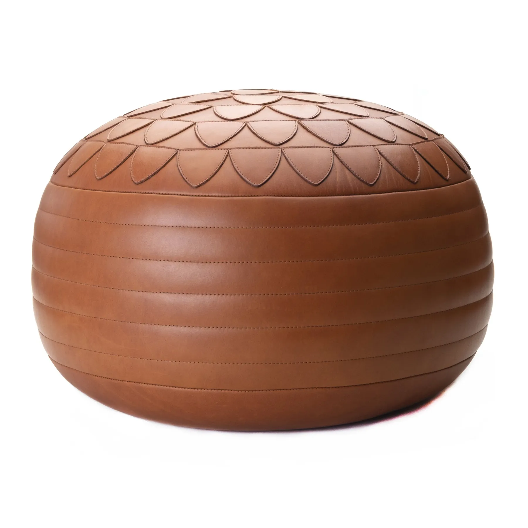 Leather side banding details and a hand crafted appliqué encircling the top of this structured and soft leather pouf. Each piece is finished with an elongated hand-laced detail on the underside.