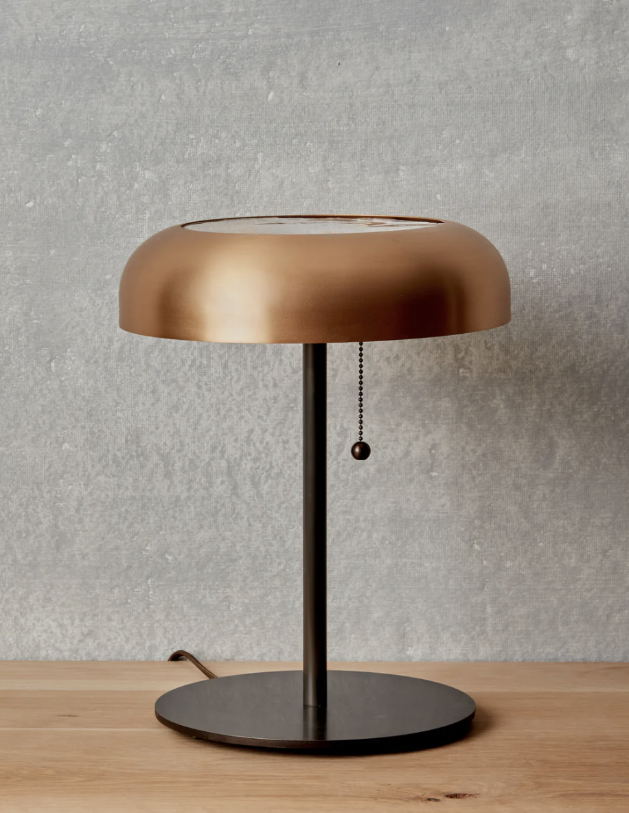 Encased in spun bronze, the Lucille emanates diffused light through a pane of selenite as a table lamp. Expect natural variations in each unique fixture.