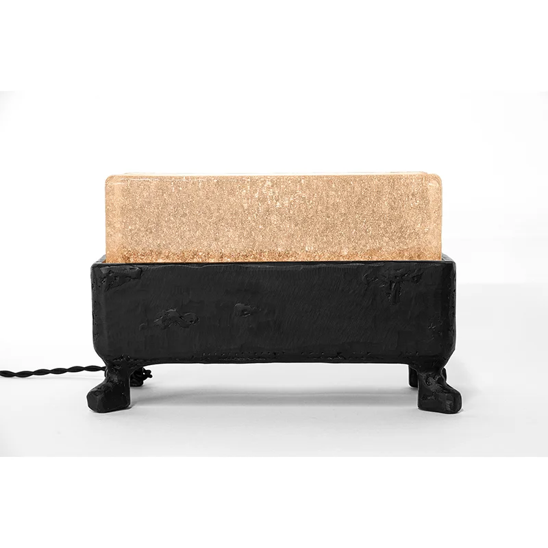 The combination of blackened steel and cast glass are combined to create this striking table lamp. Unusual geometries coupled with beautiful materials help to make this lamp truly special and one of a kind.