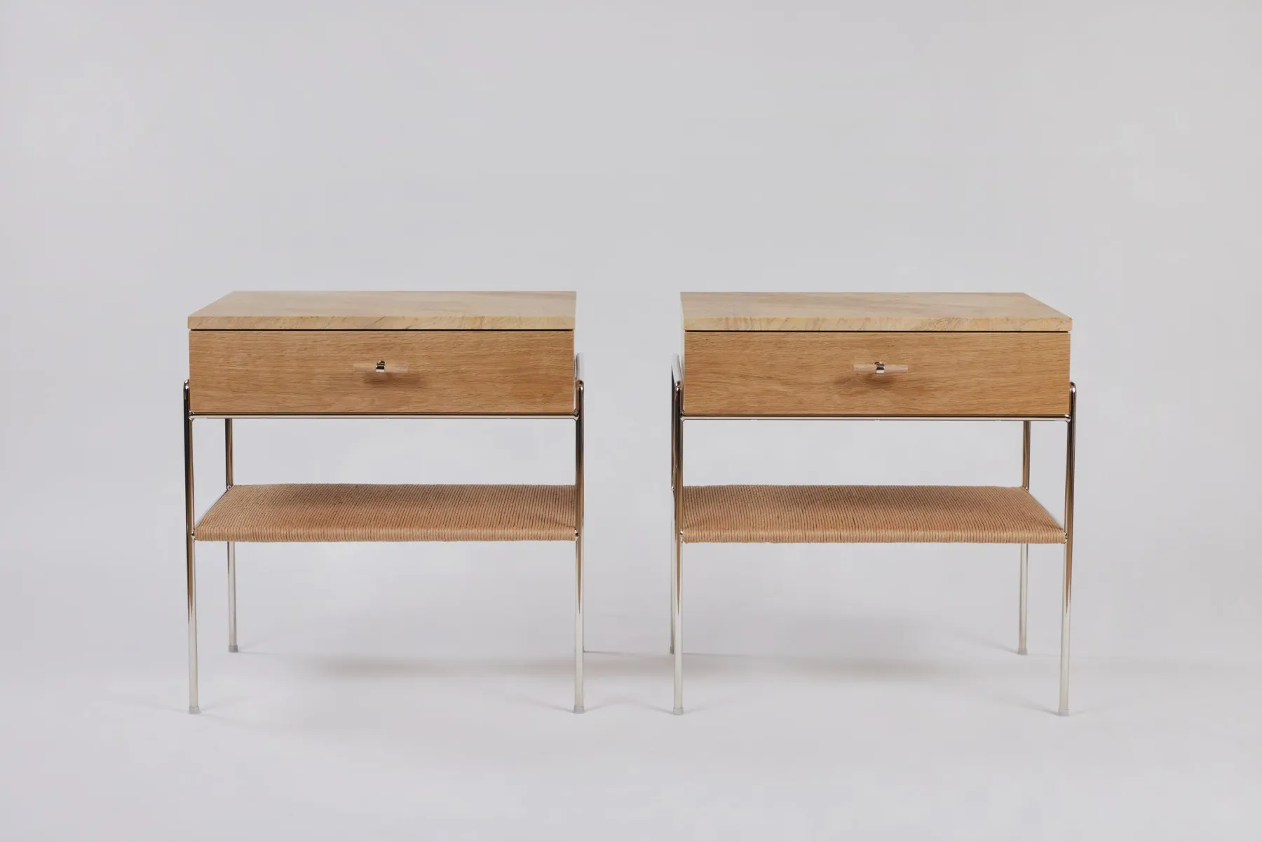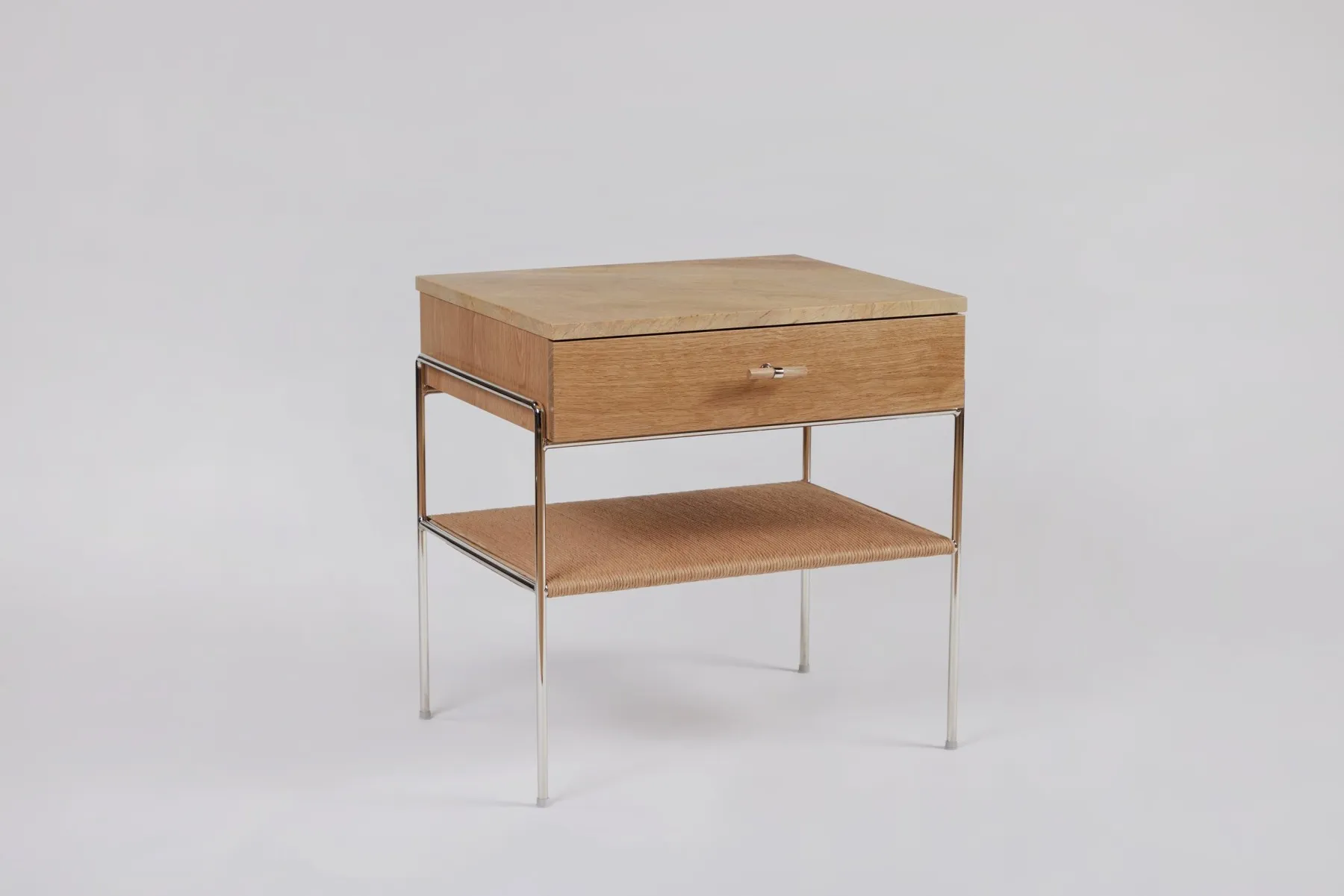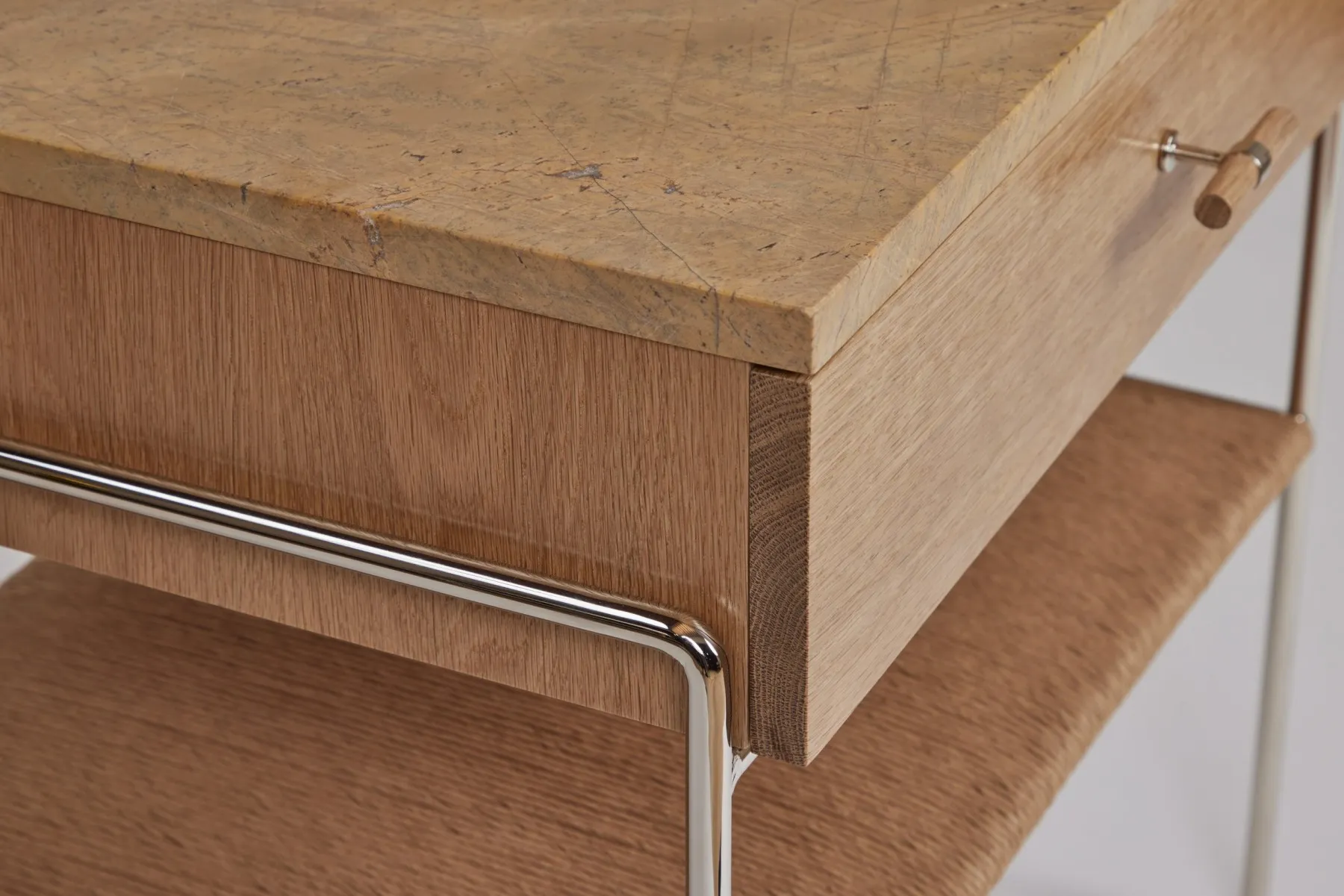 Marble and Oak Side Table with drawer and rush shelf- Polished Nickel Plated