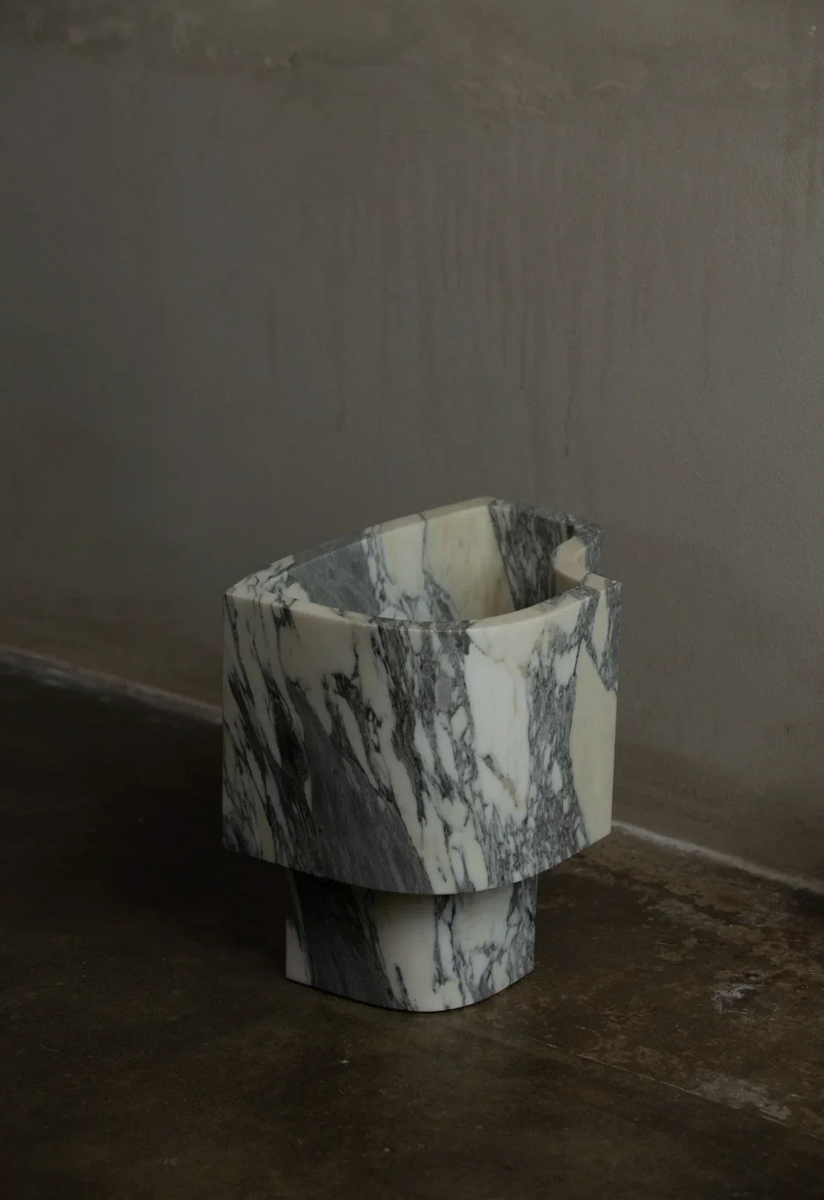 Offset Lamp is hewn from two pieces of solid Arabescato Marble. As stone is a natural material, variations of the pattern will occur from piece to piece.