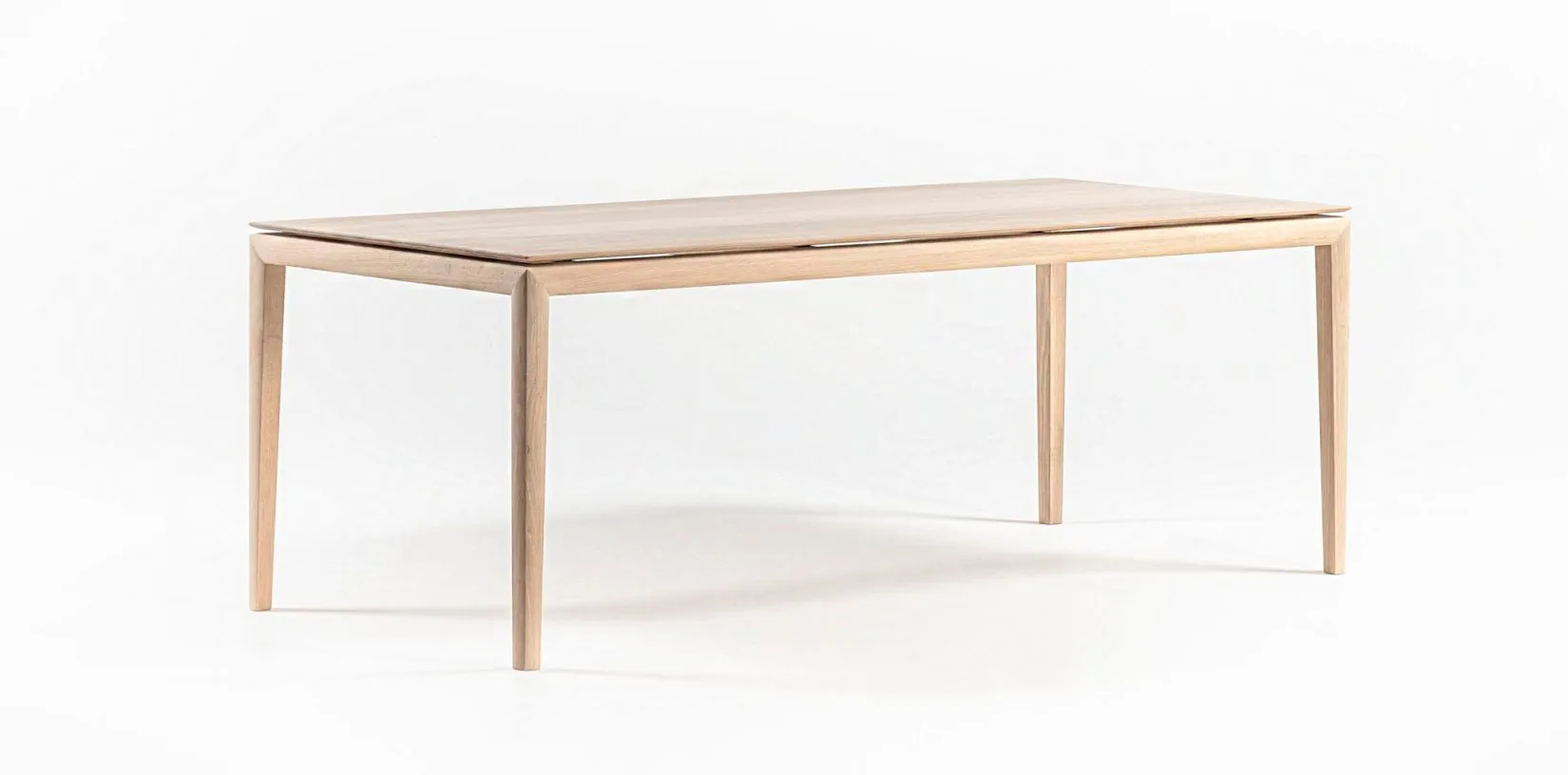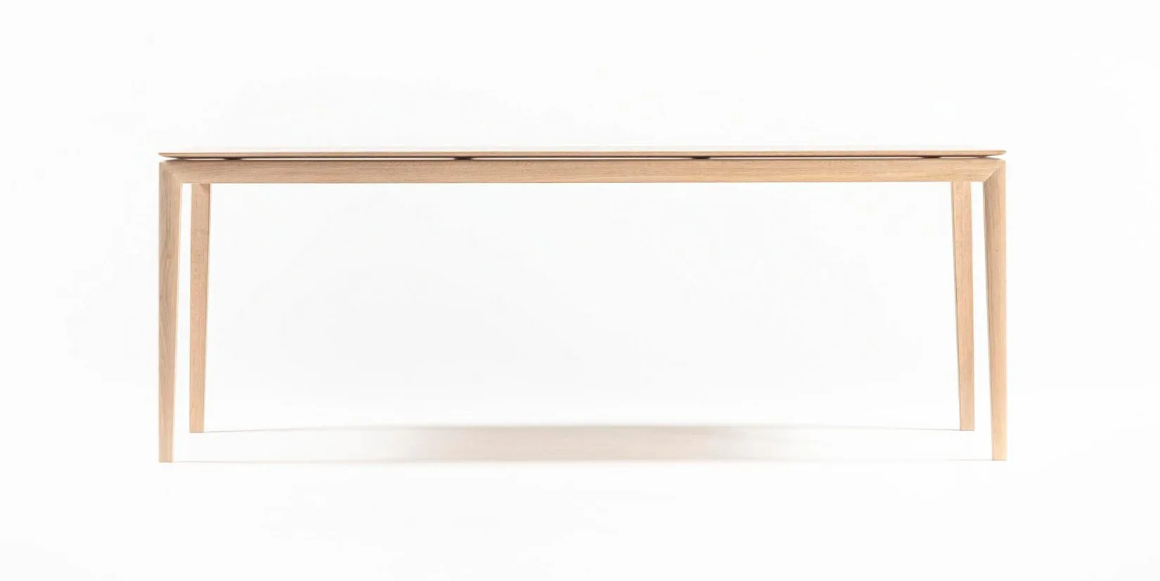 With the composition of four legs and a tabletop, we have created a simple and neat table. Carved for a coexistence of softness and sharpness, the legs are assembled through the advanced technology known as three-way mitre joining. Per its name, this process joins members that come together from three directions at precise angles of 45 degrees, with no deviation. The 27-mm-thick top surface reposes atop the leg frame in an unassuming manner that deemphasizes its thickness.