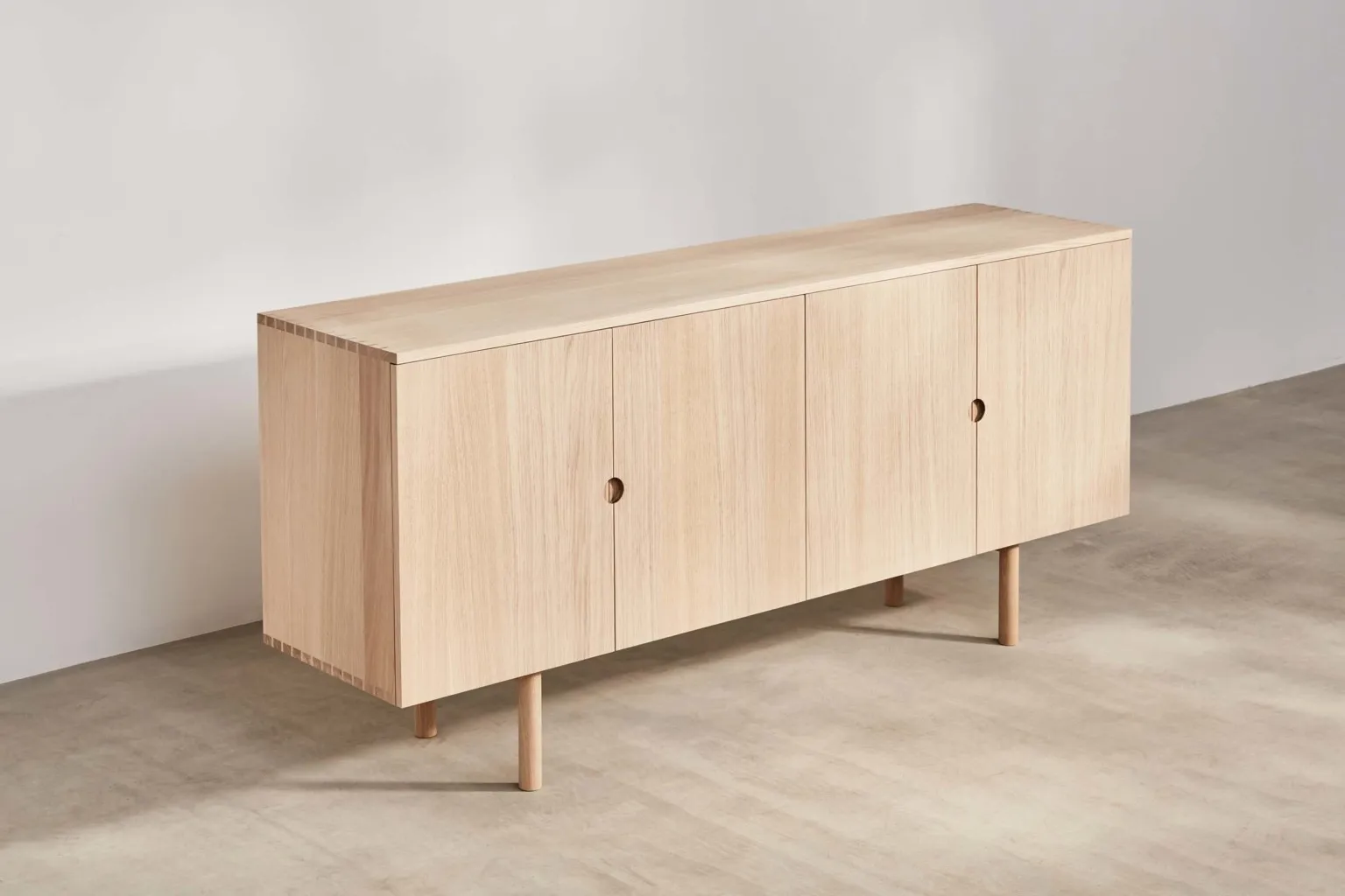 The OVO sideboard or credenza is a generous size with internal shelves and options for cable management making it a perfect solution for housing media equipment. Made in solid oak, ebonised oak or walnut, it has traditional finger jointing detail on the top and bottom edges and carefully considered detailing for the handle.