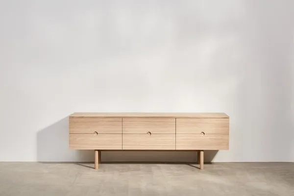 The OVO sideboard has six drawers and is made in solid oak, ebonised oak or walnut with an oiled finish. It has traditional finger jointing detail on the top and bottom edges and carefully considered detailing for the drawer pull.