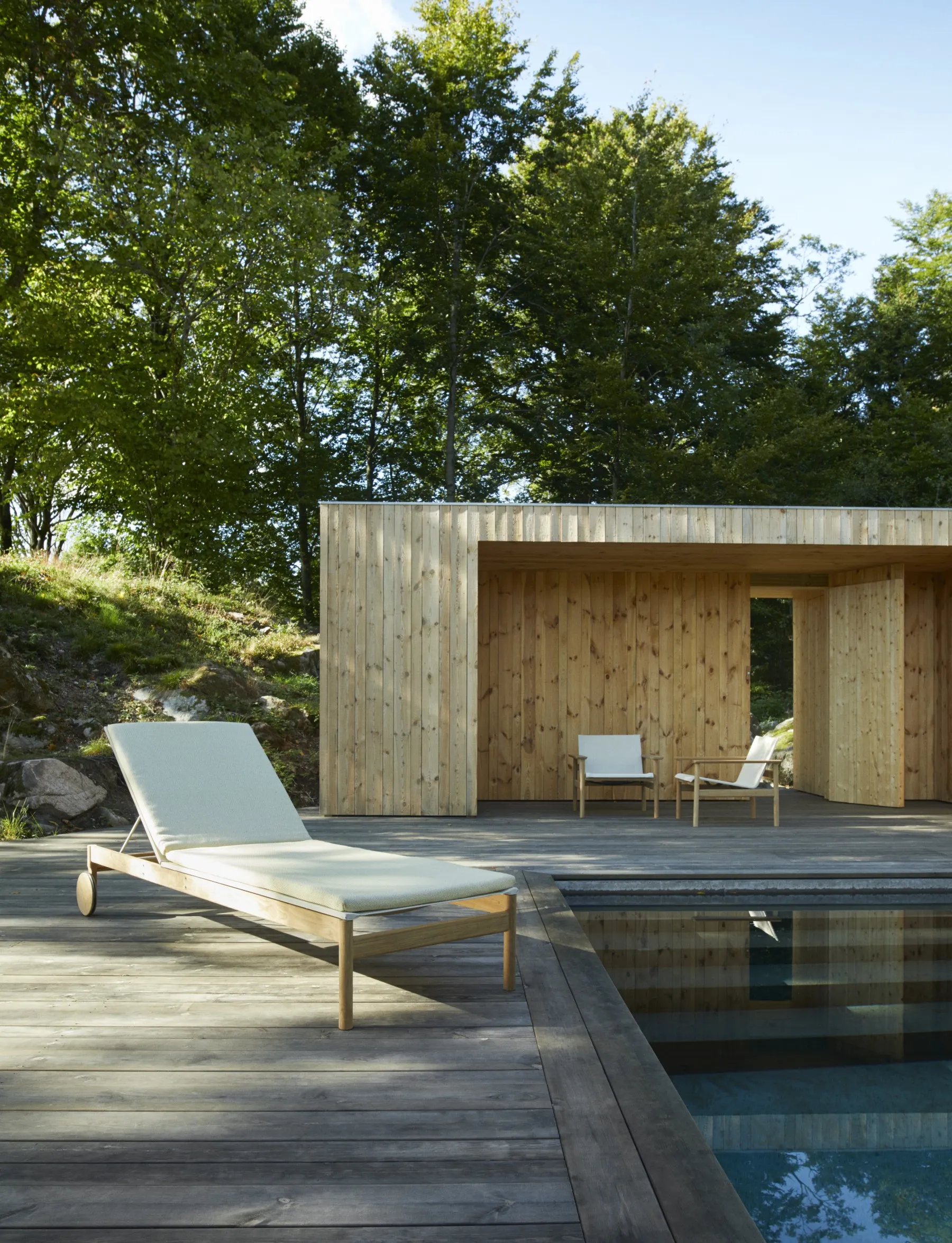 Pelagus has a graceful contemporary expression that sits lightly in nature and holds its own in urban environments. The collection is high on comfort and versatility. It is furniture that suits a lifestyle as diverse as that lived in urban cosmopolitans or far from the city and grounded in nature. Designed in collaboration with Stockholm-based Note Design Studio. Tailormade for the Pelagus Sunbed, the Pelagus Sunbed Cushion provides extra softness and comfort from head to toe. Covered in a weatherproof and durable fabric, the cushion is weatherproof and durable. The fabric colours add a fresh contrast to the teak, warm when new and silvery grey when patinated. The cushion is made of a quick-dry outdoor foam with an open-cell structure that allows water to pass through while holding its shape and remaining firm year after year.