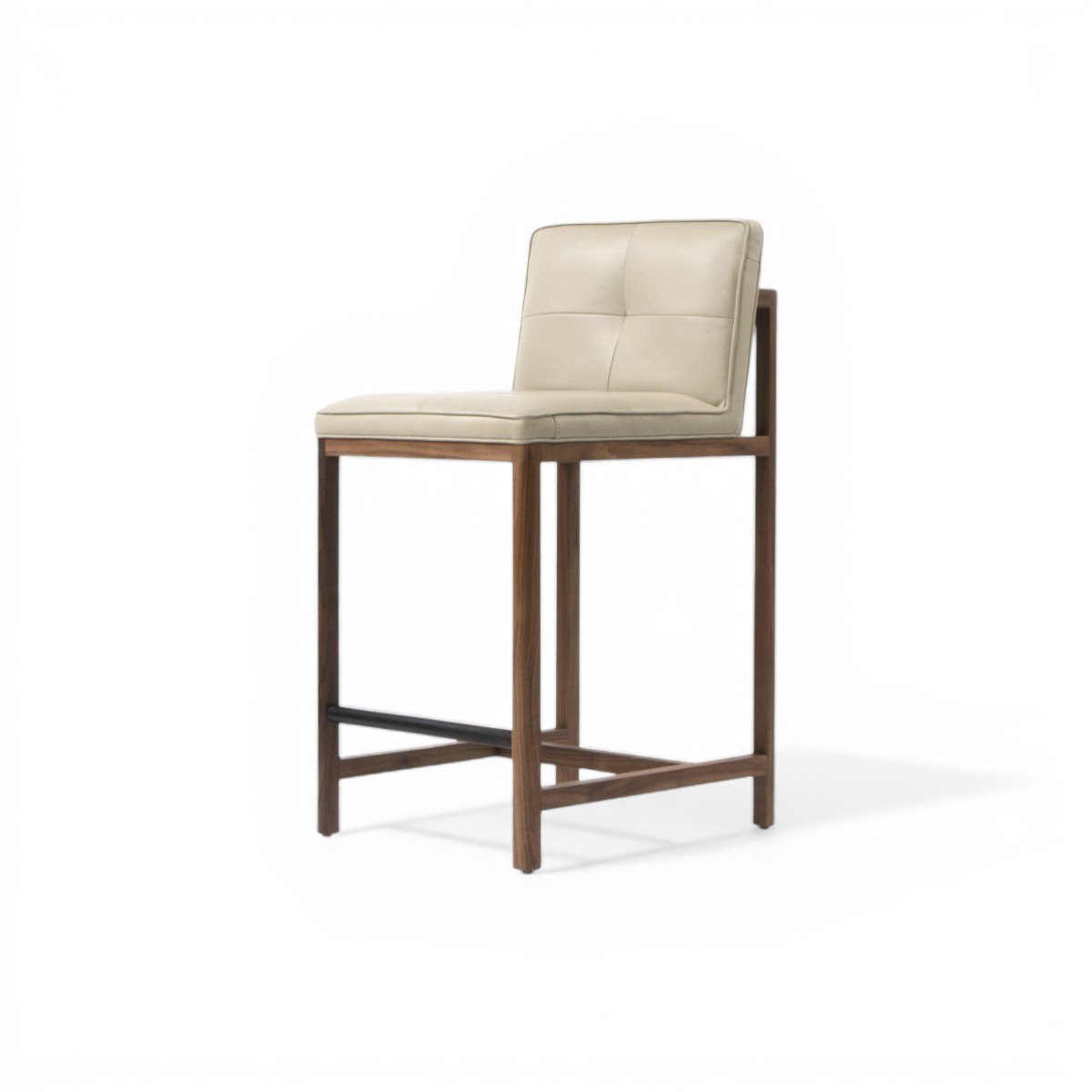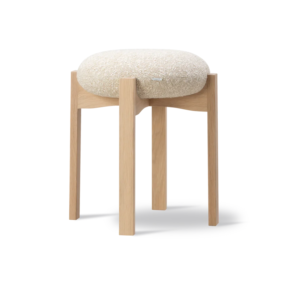 The sculptural Pioneer stools by Maria Bruun combine good seating comfort, functionality and a sculptural design language that elegantly combines the seat’s soft and round design with the wooden frame’s sensuality. The four vertical legs of the wooden frame are united in a cross composition with elegant indentations, where the light, the upholstered seat cushion, is placed on top.