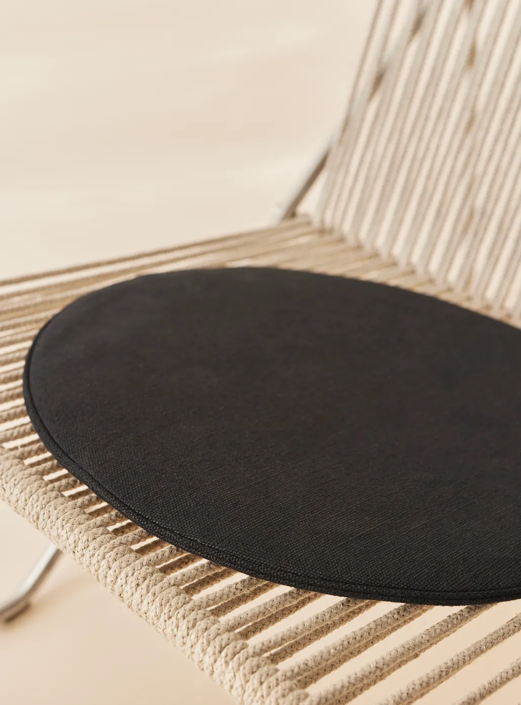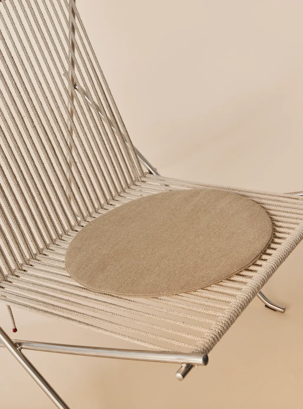 The chair consists of two materials - one flag halyard length and seven steel tubing pieces welded into a unified frame. It is available in three configurations: Black powder-coated steel with natural halyard, Stainless steel with natural halyard, or Stainless steel with black halyard. An additional cushion is available in three configurations: Natural canvas, Black canvas and Black Grace leather. Cushions cannot be sold separately.