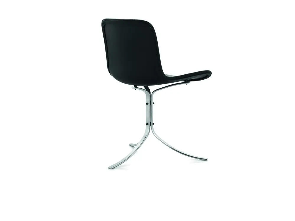 The PK9’s unique shape is characterised by three pieces of satinbrushed stainless spring steel that act as a column, carrying the leather seating element. Poul Kjærholm was inspired by a sand imprint of his wife’s behind from a day at the beach. Later, during the design process, Hanne Kjærholm sat in boxes of clay to find the most optimal and comfortable solution.