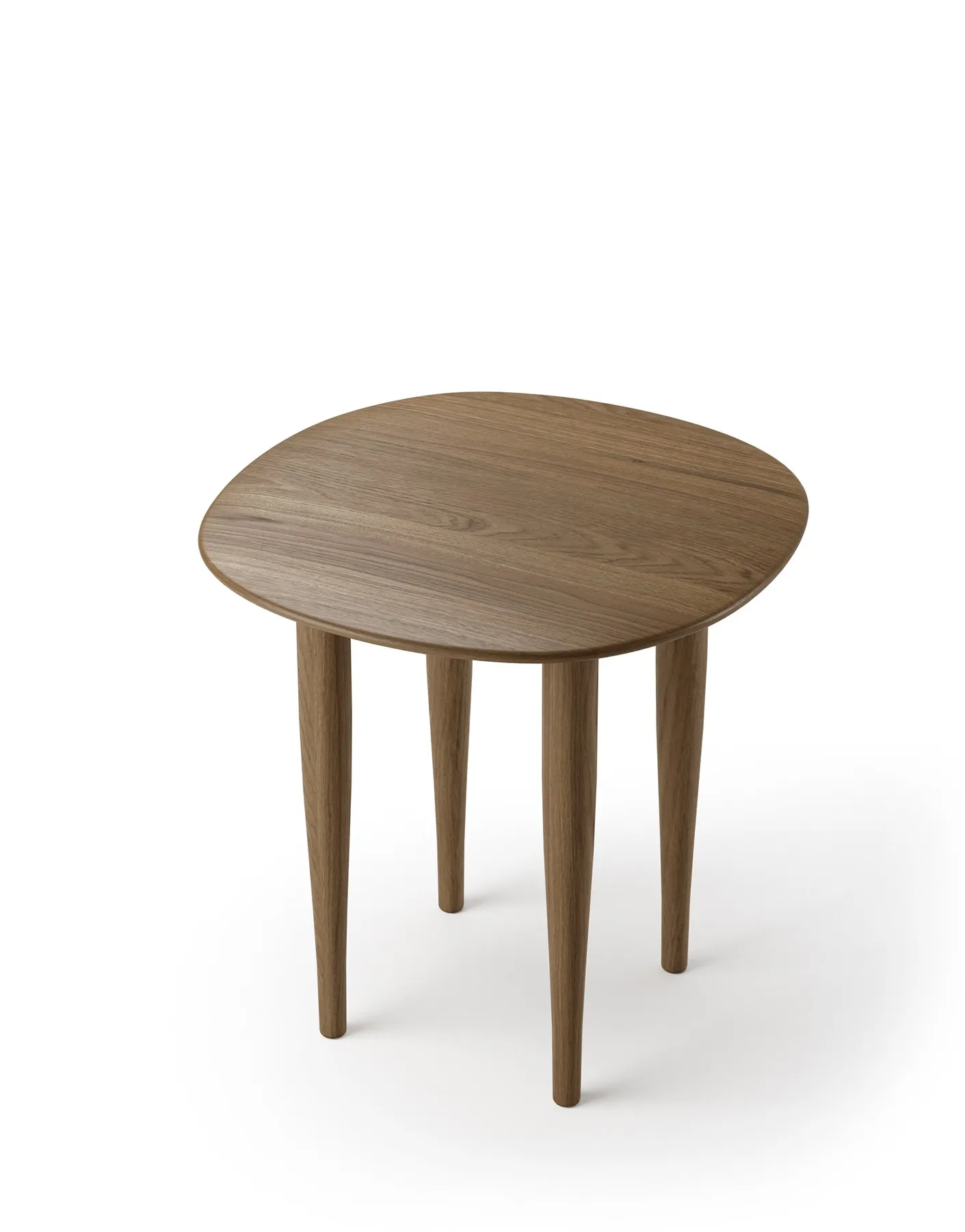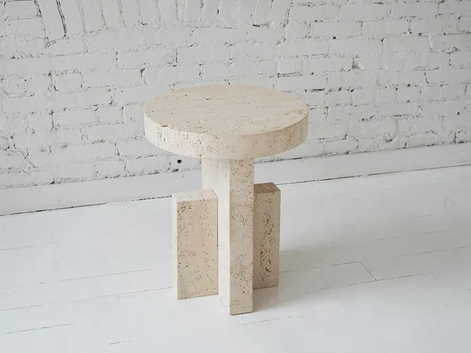 This sculptural side table is composed of three intersecting planes of three inch thick stone. Large square tenons visible on the table surface speak to the simple woodworking-inspired construction.