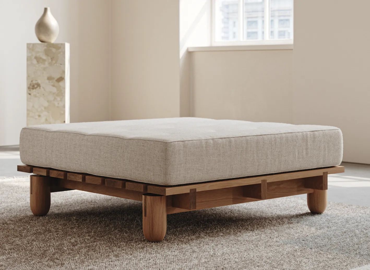 The Platform Ottoman consist of a solid wood frame, and hand stitched tufted cushion. Fabric is Customer's Own Material.