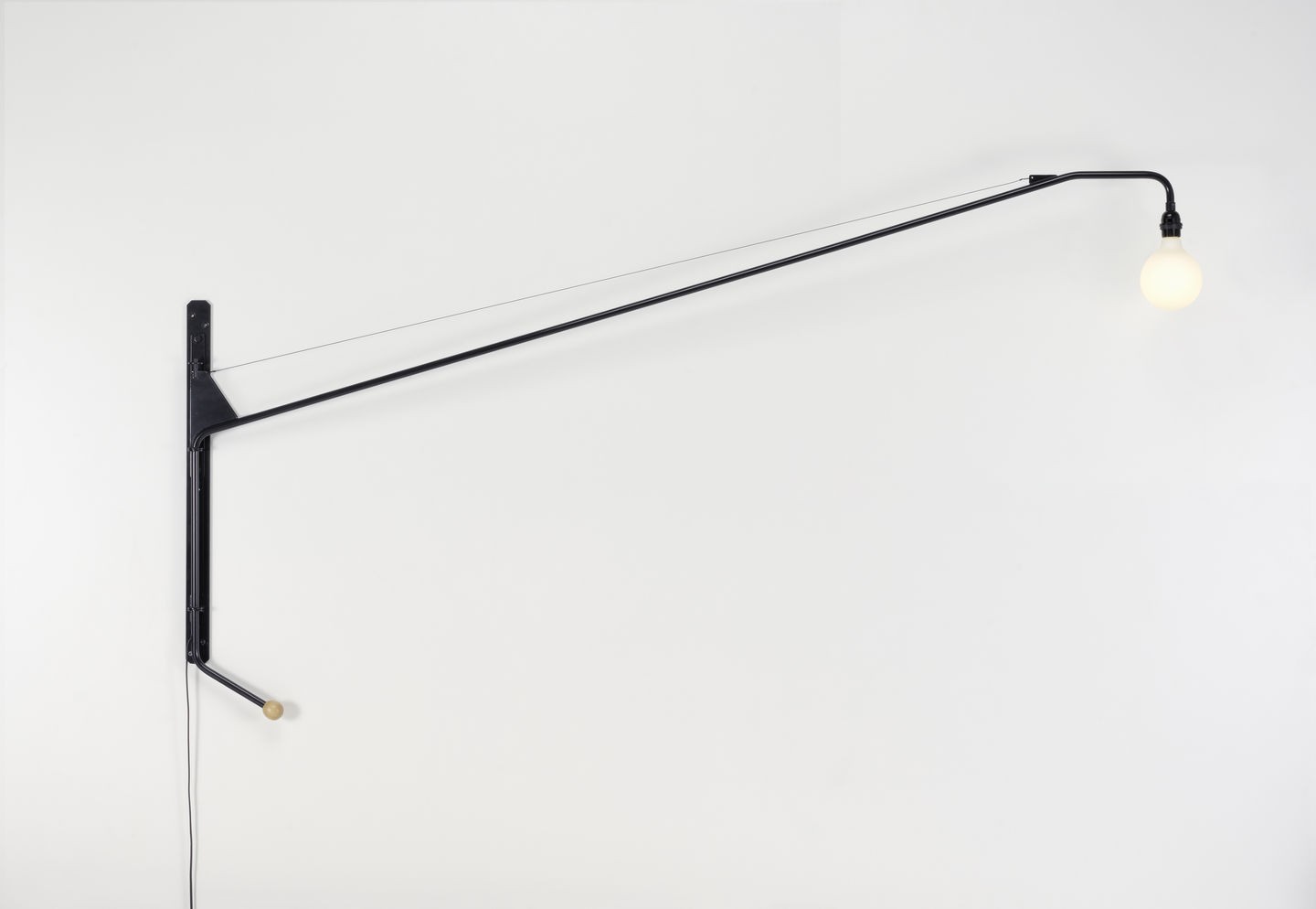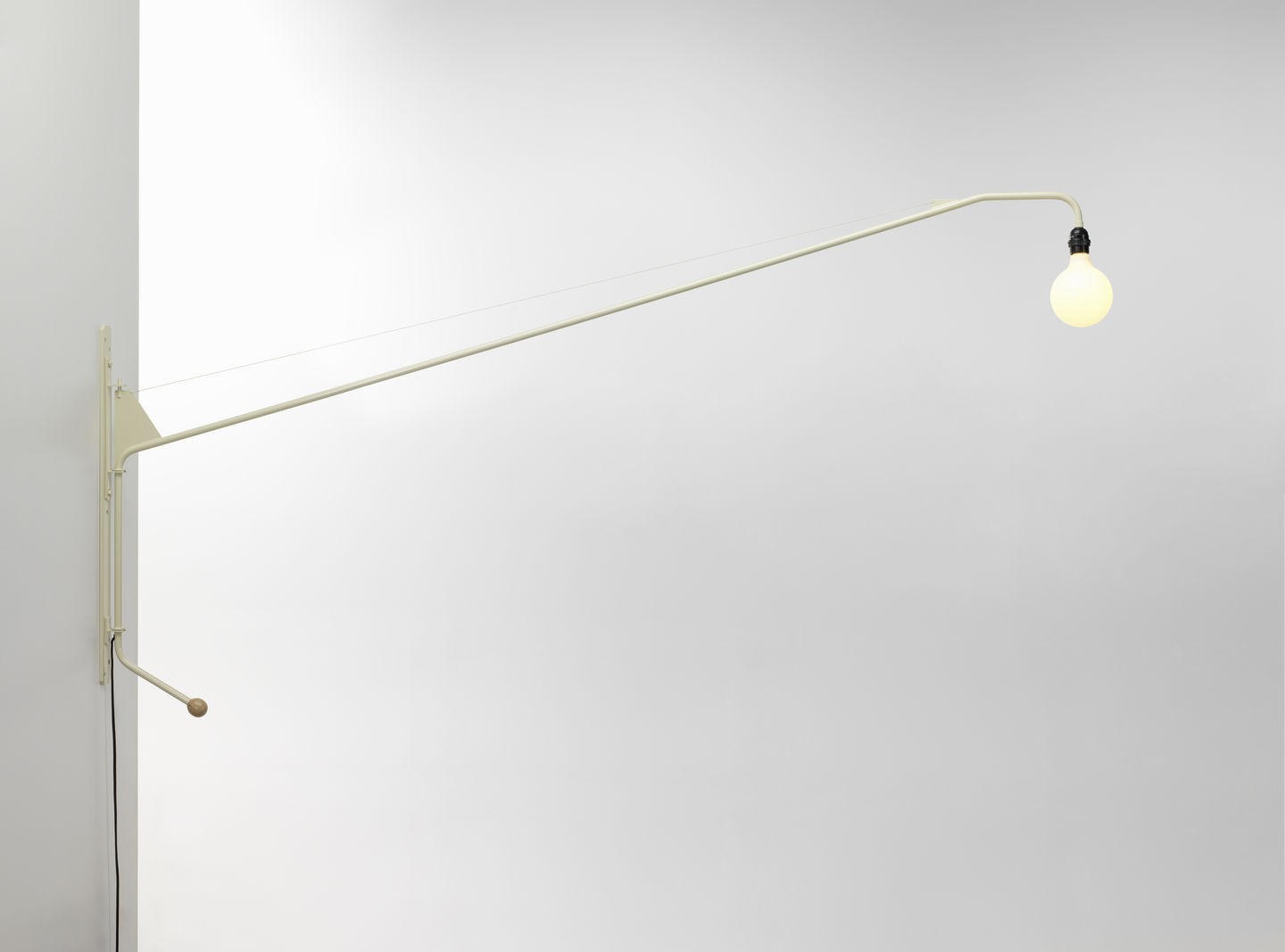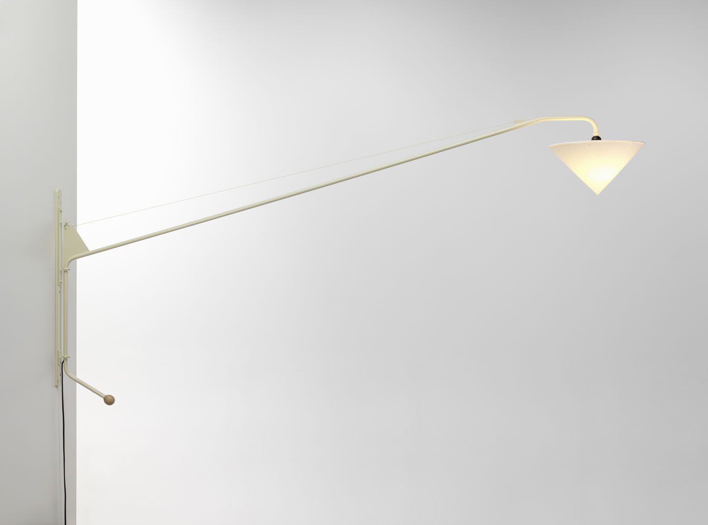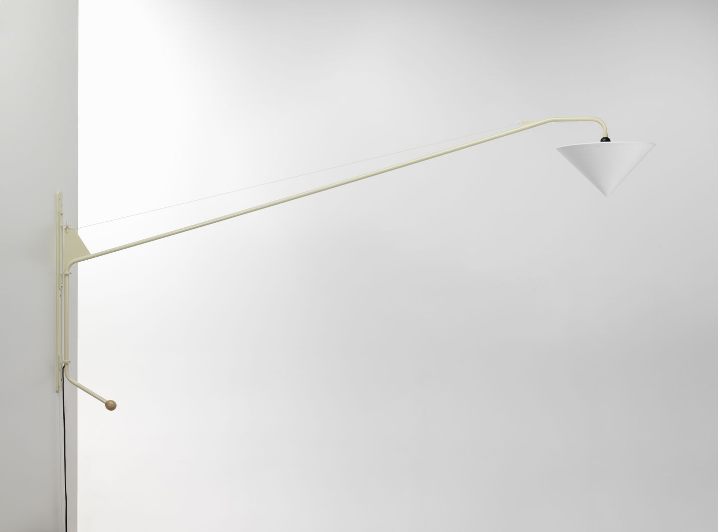 Designed as a pivoting wall lamp for the 'Maison Tropique', Potence (1950) is regarded as one of Jean Prouvé's puristic masterpieces. The dimmable luminaire is over two metres long.