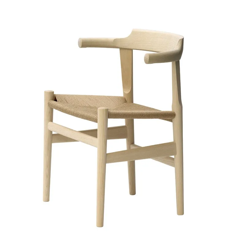 pp68/pp58 is optimised to be practical. The short armrests makes it easy to enter and move around the chair. It fits well underneath the table and can also hang from the table top to make cleaning easier. The solid wood tenon joints have been tested to withstand one ton of pulling strength. The combined arm and backrest is made of one piece of solid steam-bent wood.