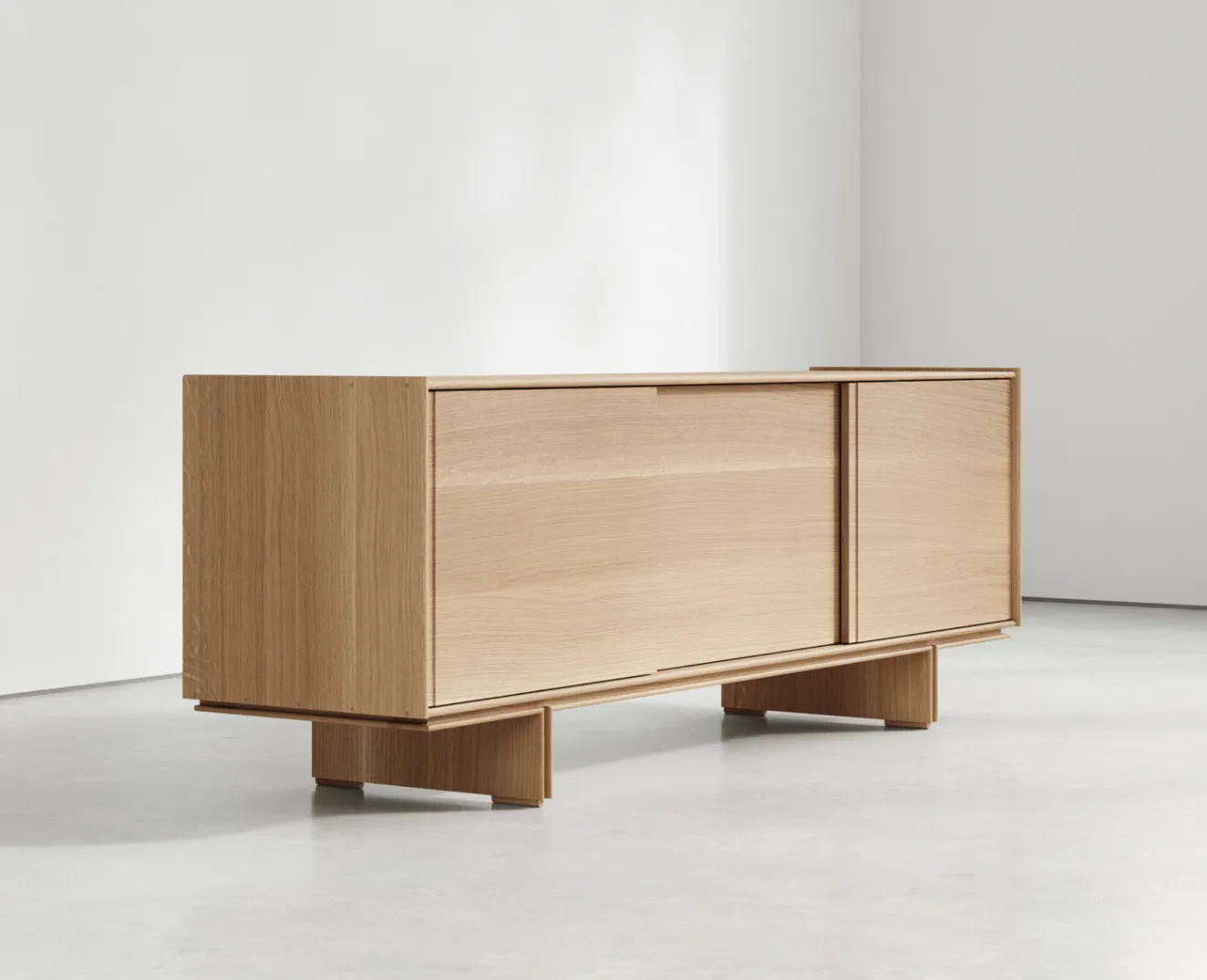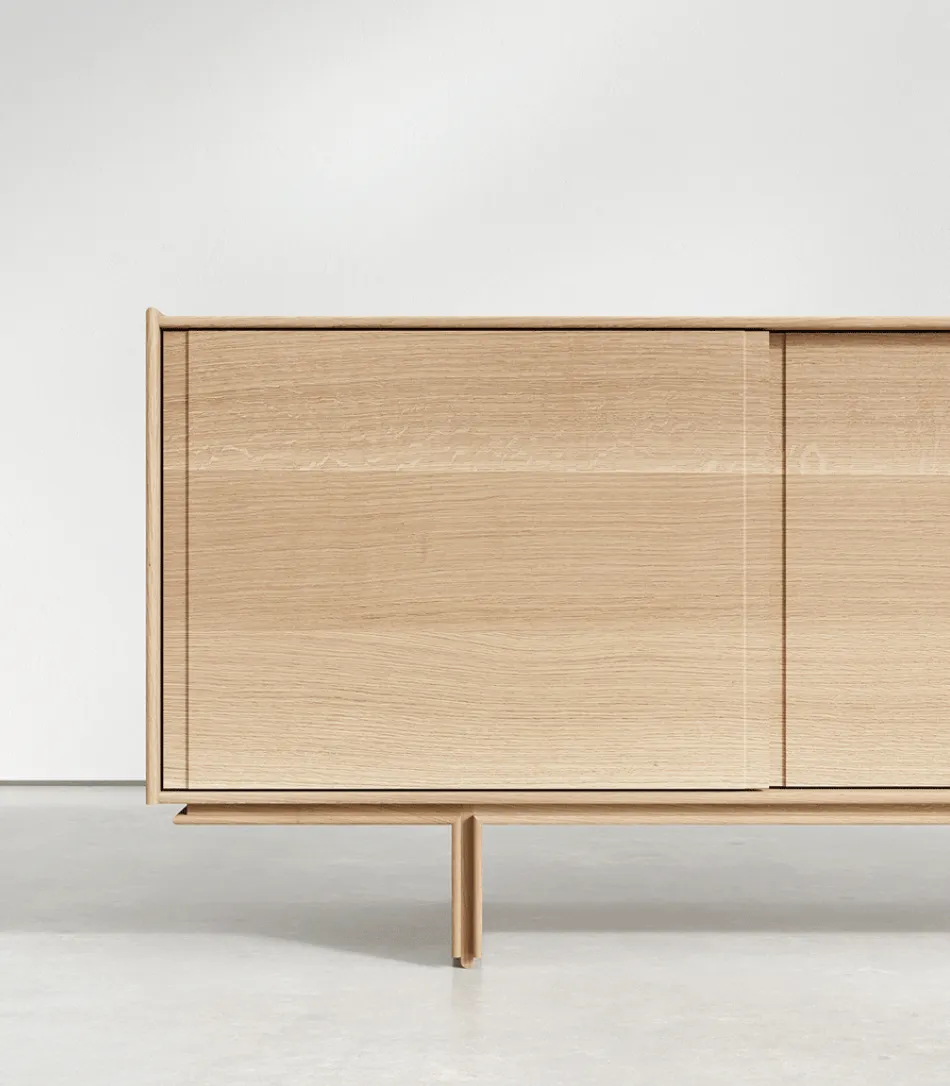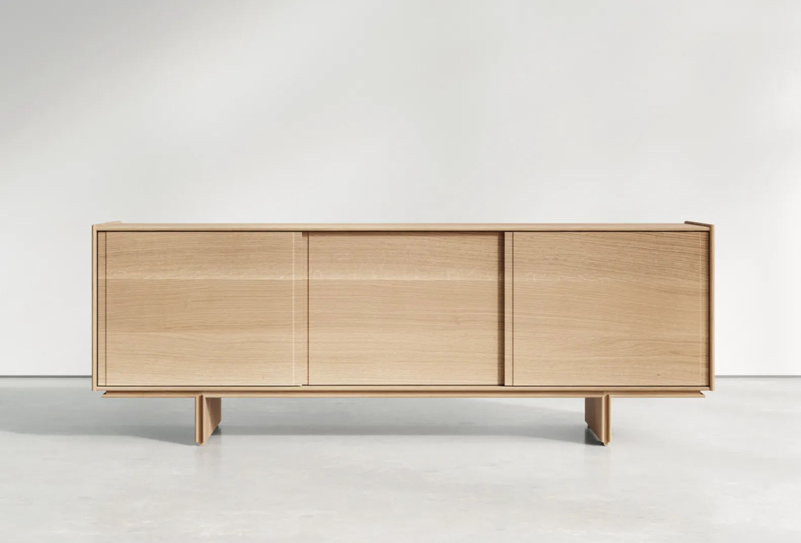 The Profile Credenza is an elevated take on traditional cabinet construction with a clean, minimal edge framing matching sliding doors. Interior outfitted with either adjustable shelving or drawers.
