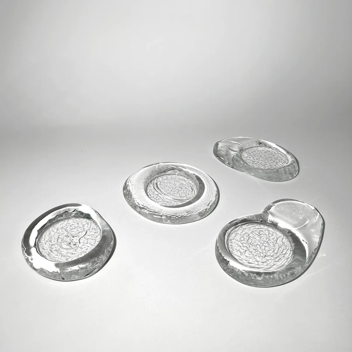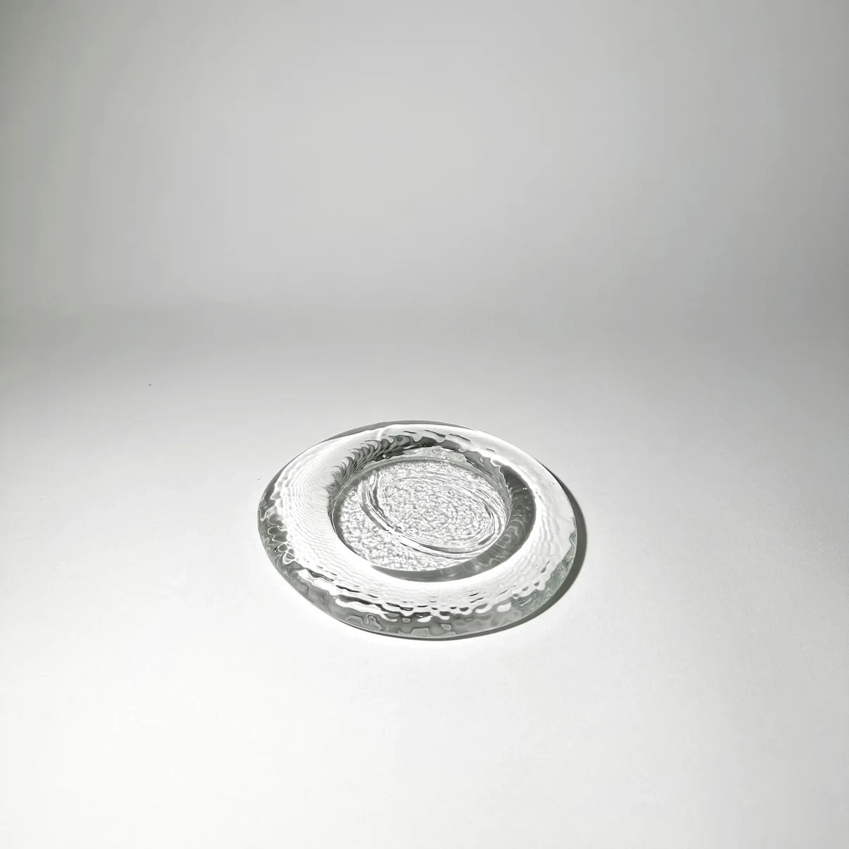 Puddle votives look like small pools of water, or a magnified drop of dew. They possess a circular cavity on their surface to hold candles, incense cones or valuable objects, including jewelry. Each Puddle votive is a sculpture as much as a vessel and no two will look the same.