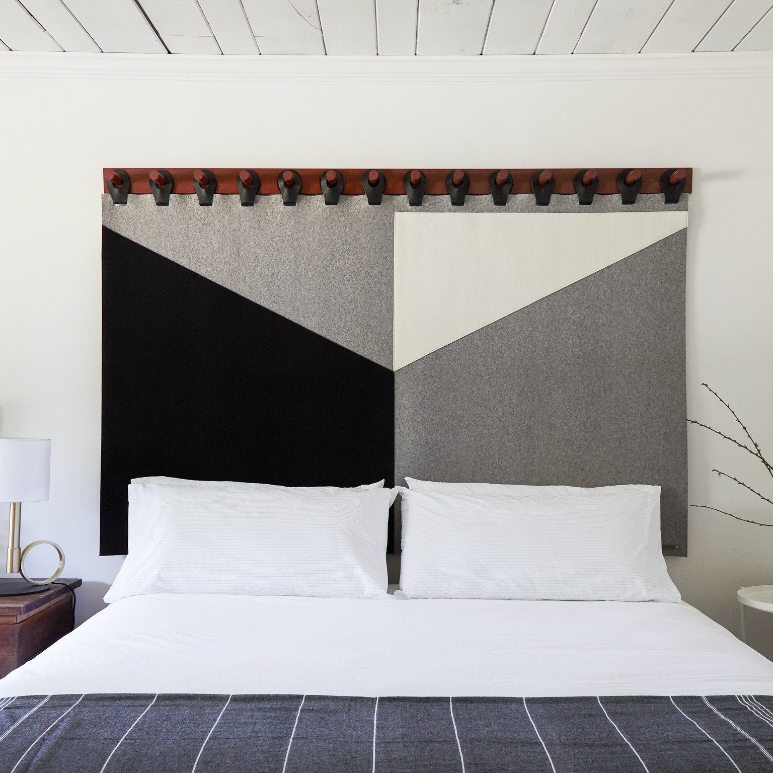 Sized using headboard dimensions, this heavyweight tapestry is handcrafted with layered architectural wool felt panels and structural leather top links designed to be placed on a customized wooden peg rail (included).