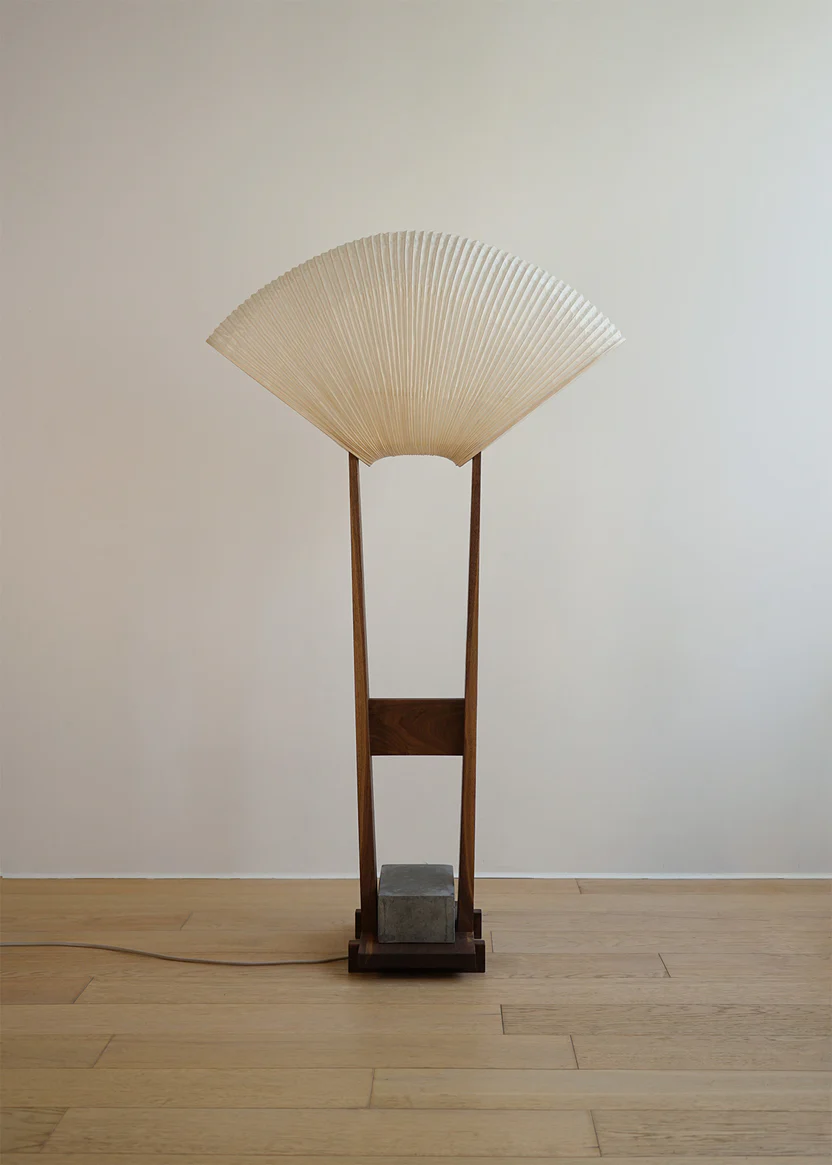 Relic I Lamp is a light sculpture that reimagines the folding fan as an object and a symbol of spatial poetry. A pleated paper illumination unfurls in sweeping arcs, held upright by a totem-like wood base and anchored down by a cast concrete block. The form evokes movement caught in stillness—demonstrating a fan poised mid-opening in a sculptural unfolding of air, shadow, and light.