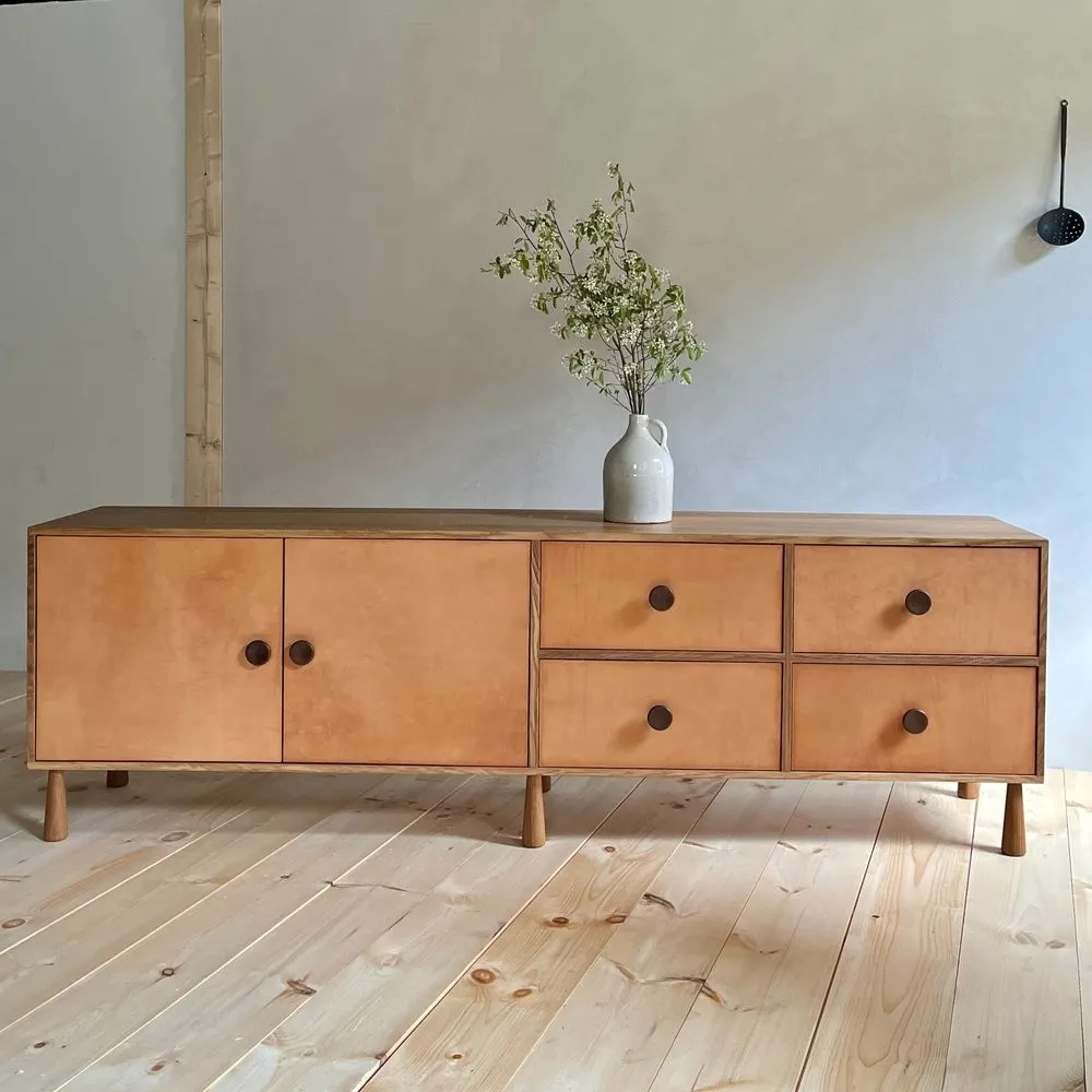 natural white oak case and legs, fumed oak pulls, russet leather fronts