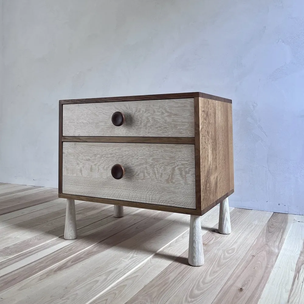 Shown in fumed oak case and pulls, bleached white oak fronts and legs.