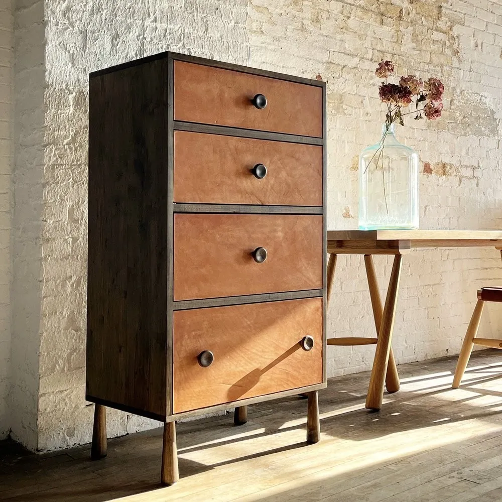 oxidized white oak case and legs, fumed oak pulls, russet leather fronts