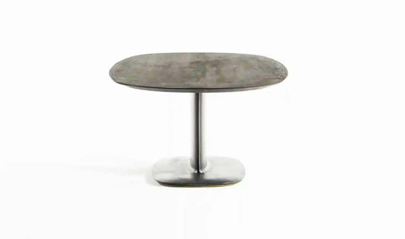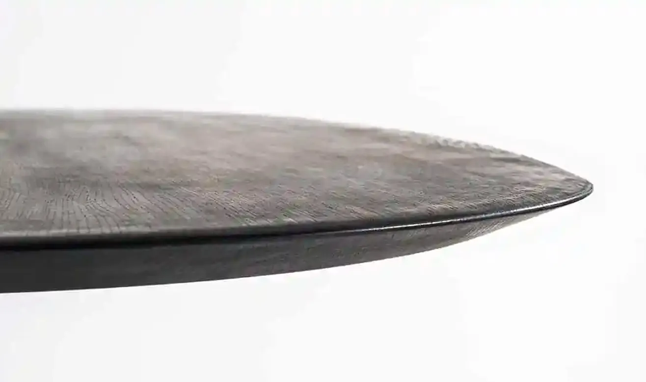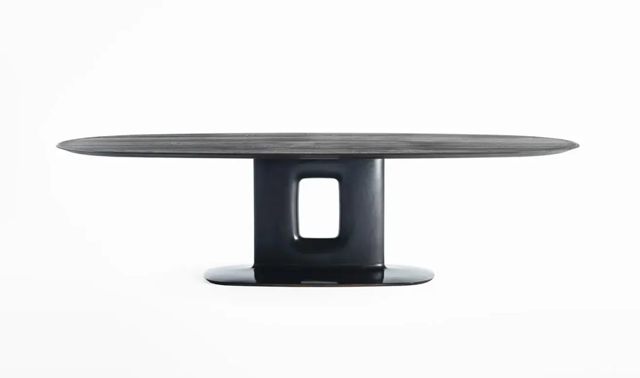This table is modeled after our Elliptical cylinder casting bronze table. We aimed to bring to life a sculpture-like shape, which draws attention to the fact that its hallowed leg section is cast metal. By hollowing out the support leg, we succeeded in not only giving the table a bold presence; in terms of structure, the two support props also allow the table to hold the large tabletop.