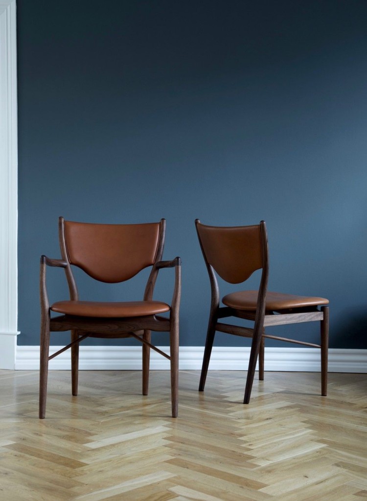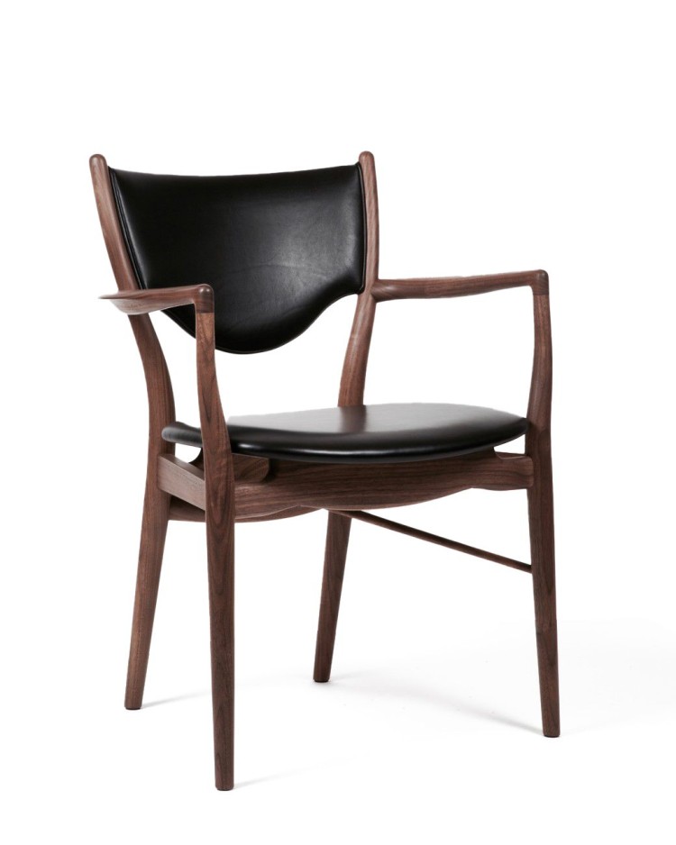The 46 Armchair embodies excellent comfort and high quality materials, representing the very best of Danish Modern furniture design. It was originally designed in 1946 for the Copenhagen Cabinetmakers’ Guild Exhibition for master cabinetmaker Niels Vodder. In the years between 1947 and 1949, Finn Juhl modified the chair into a simpler, more aerodynamic version for the furniture manufacturer Bovirke. It is this later version that we have relaunched