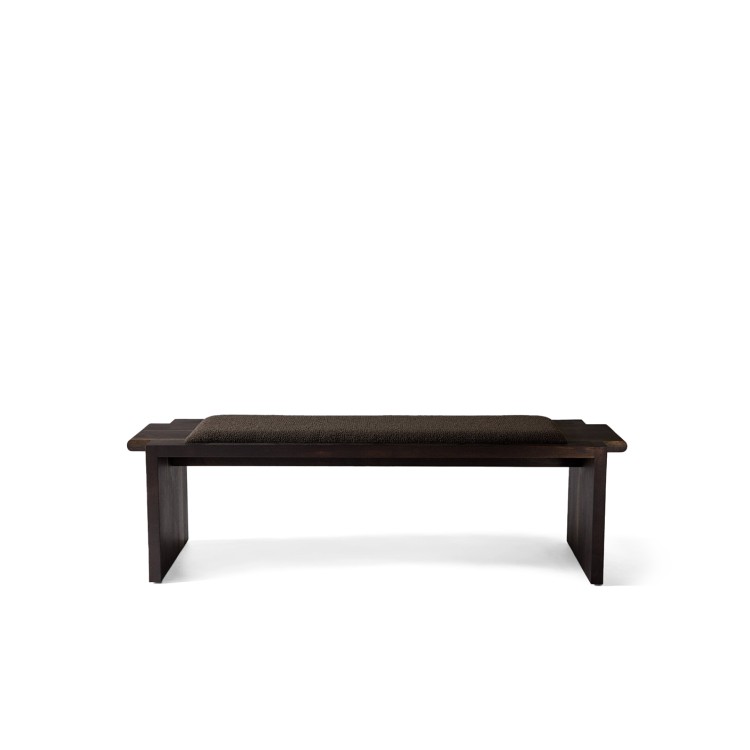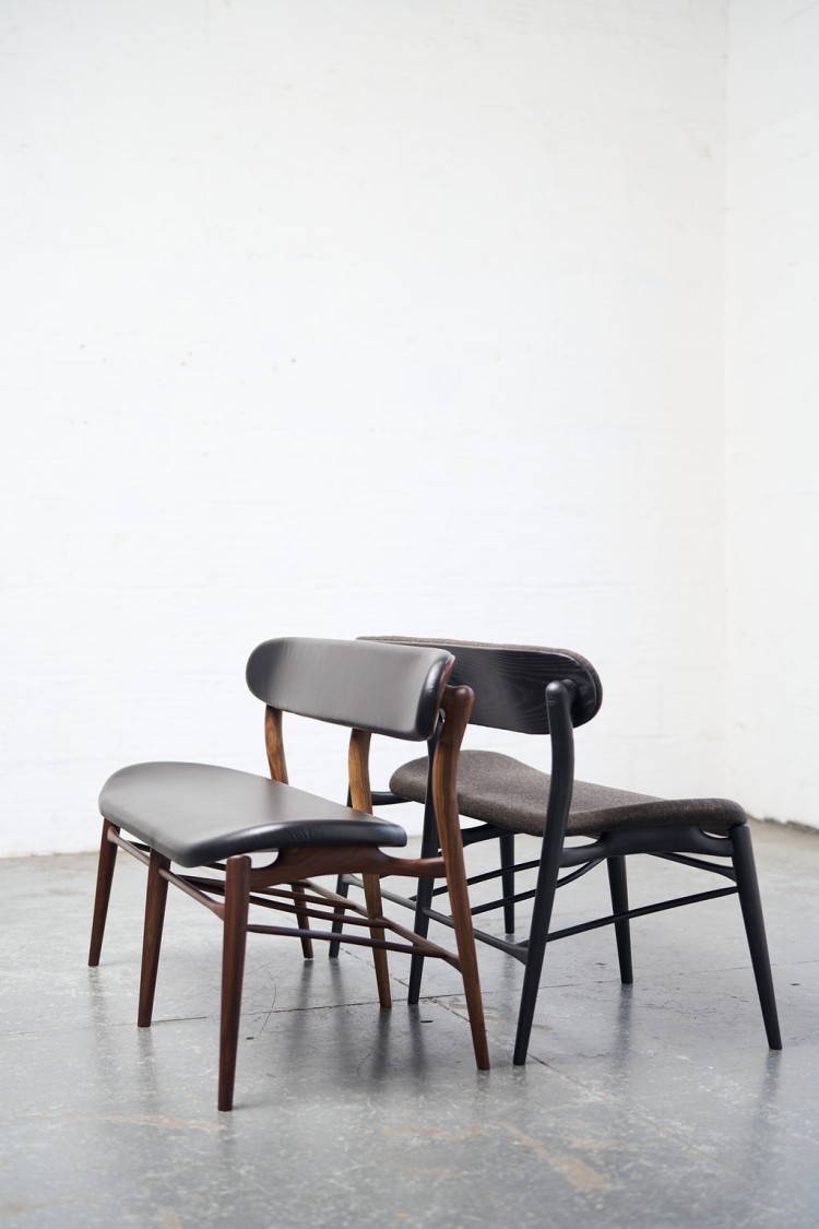 The fjoon settee features a vacuum-laminated upholstered seat with a sweeping compound curve, stepped mortise-and-tenon joinery with a friction wedge, and a patent-pending wood plug system which allows for re-upholstery down the line without having to destroy / re-fabricate any chair parts.