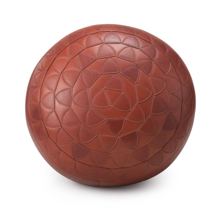 - Finishes- Leather side banding details and a hand crafted appliqué encircling the top of this structured and soft leather pouf. Each piece is finished with an elongated hand-laced detail on the underside.