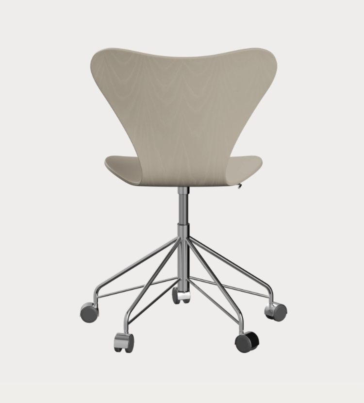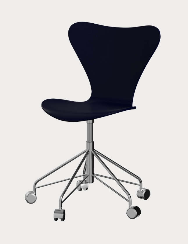 - The Series 7™ chair is an icon in modern furniture history, designed by Arne Jacobsen in 1955. Its unique shape is timeless and incredibly versatile, displaying character without overpowering the eye. The chair is made from 9 layers of pressure moulded veneer for strength, flexibility and durability despite its slender form. This is the most popular design within Fritz Hansen’s chair collection. The height-adjustable 3117 swivel chair features an elevated five-legged steel base with high-quality aluminium capped castors, originally designed by Jørgen Rasmussen in 1965 for the KEVI chair. The castor’s twin-wheeled design improves manoeuvrability, and customers have a choice of hard or soft wheels that glide smoothly on a range of surfaces without damaging the floor.