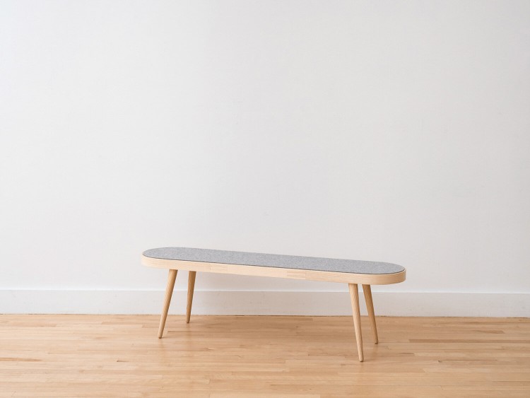 Topped with plush merino felt, this slim bench is designed for use at the end of your bed or in an entryway. Age-old construction techniques are used to create this modern, streamlined piece of furniture. Softening high-quality air-dried wood with steam, and then bending it while hot, creates the looped forms of this bench. The wood is then cured for several weeks before being cut and assembled. A hand-applied oil finish complements and highlights the natural variation in the wood.