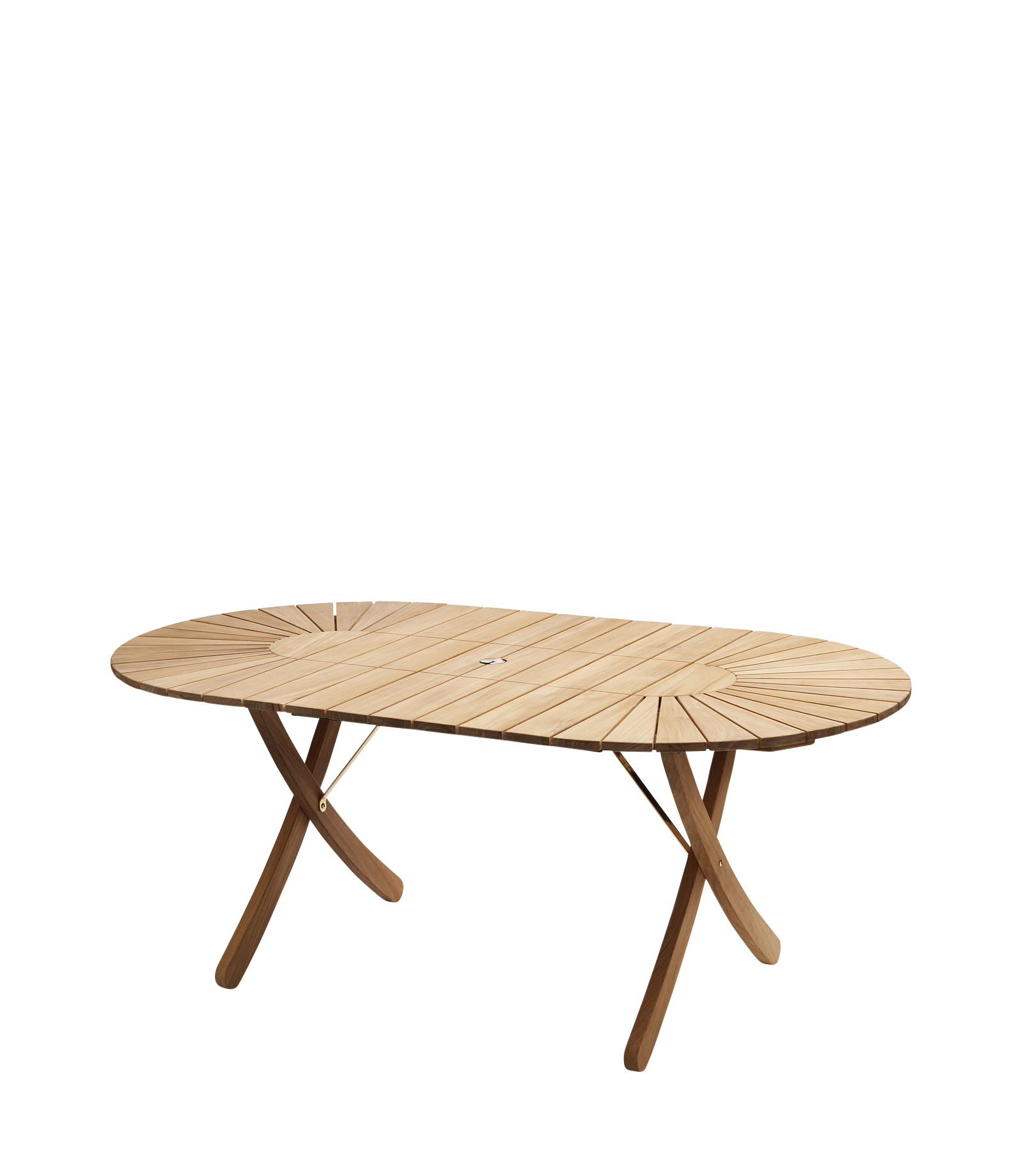 Expressing natural elegance, the solid and spacious Selandia Table is the essence of practicality meets beauty. Curved crossover legs support the stadium-formed and slatted table top which is easily extendable with either one or two extension leaves. A hole in the centre allows for an umbrella over the table. A beautiful brass plate covers the umbrella hole when not in use.