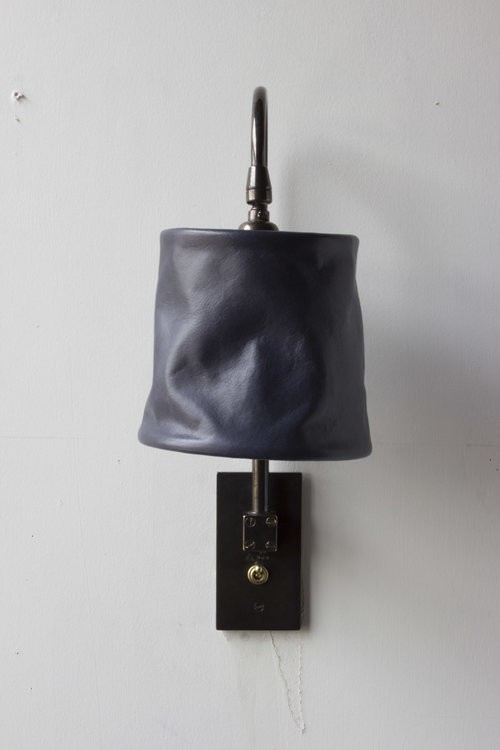 Solid machined dark patinated brass with hand-dyed waxed leather pivoting shade.