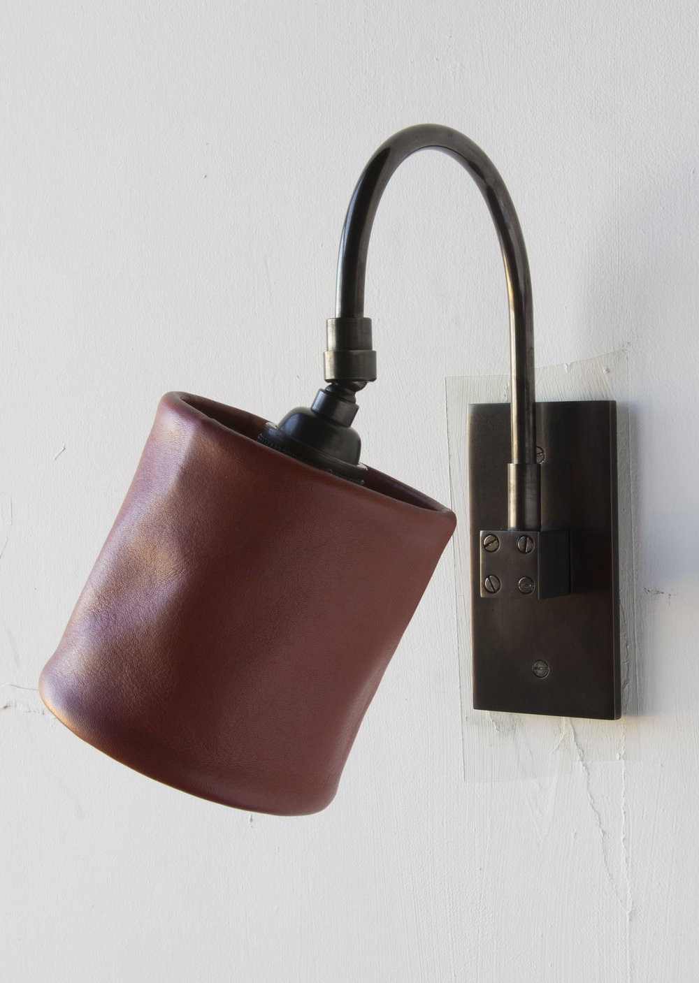 Solid machined polished unlacquered brass with hand-dyed waxed leather pivoting shade.