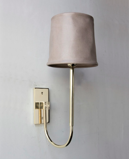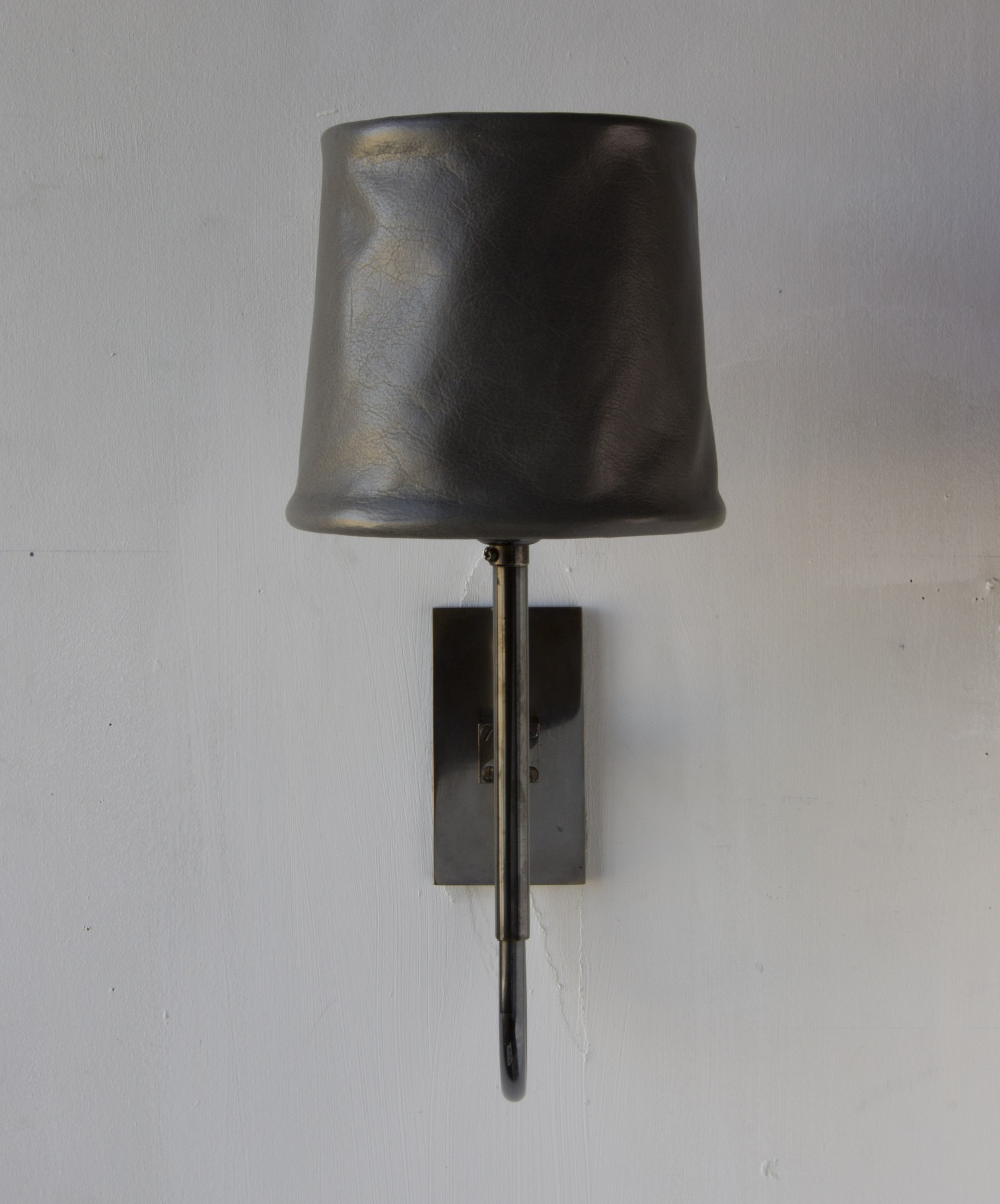 Solid machined polished unlacquered brass and hand-dyed waxed leather shade.