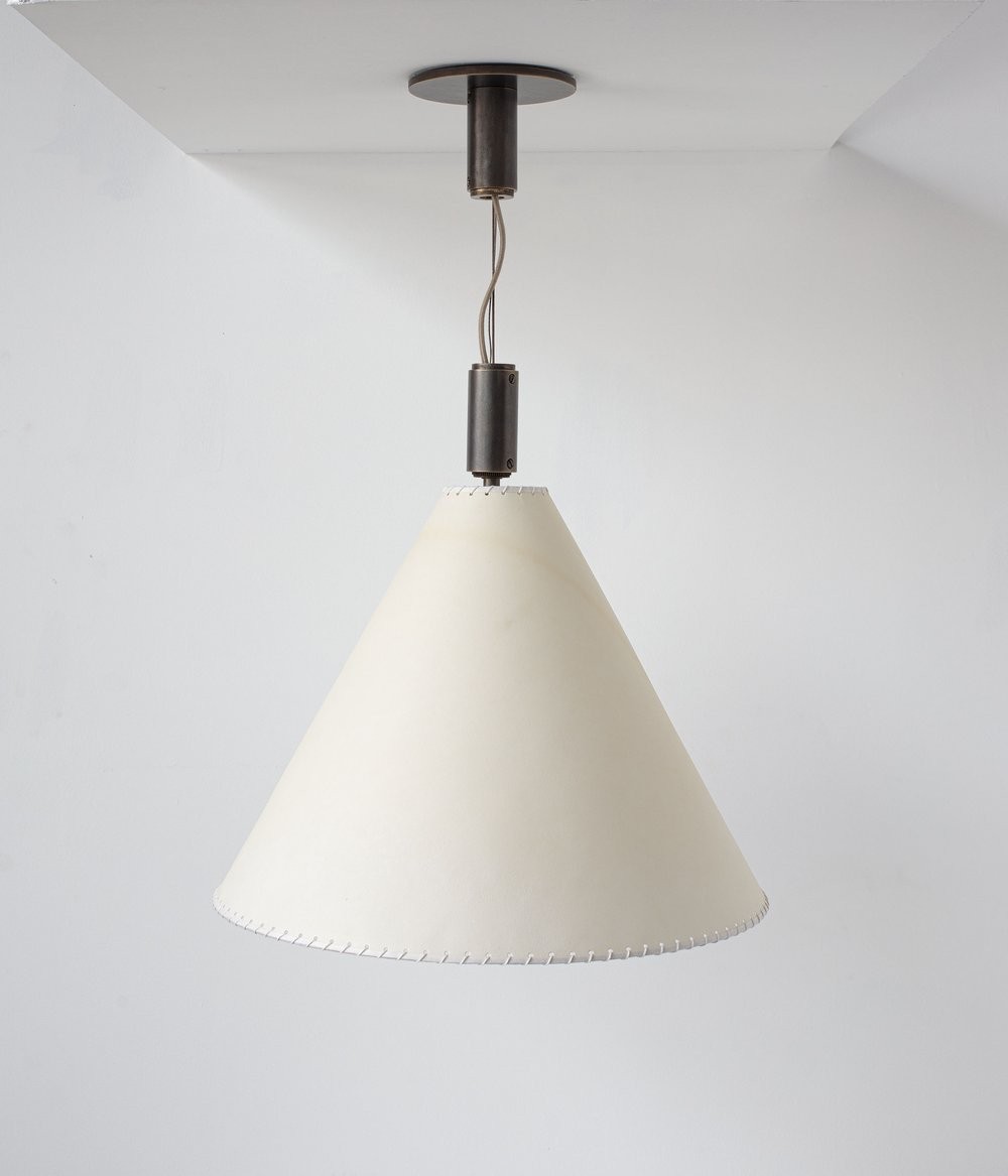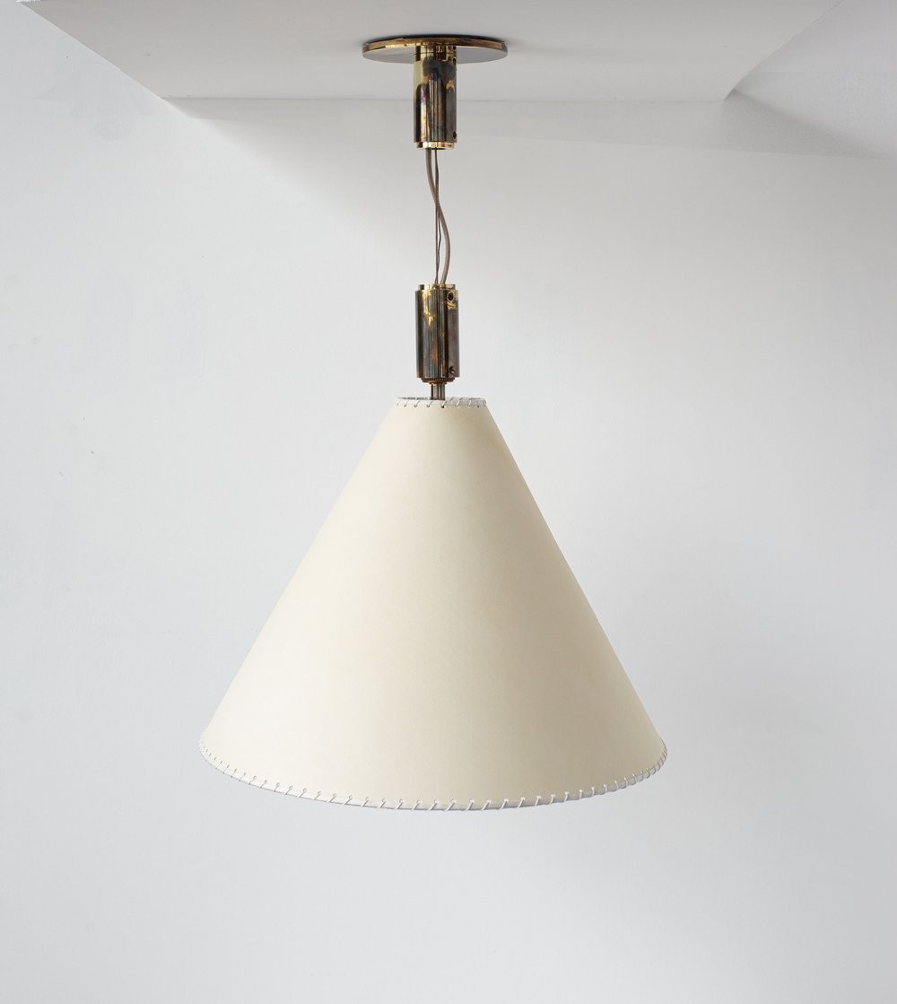 Solid machined brass, hand-stitched goatskin parchment shade with diffuser. Goatskin parchment is an excellent diffuser of light and is naturally figured and textured, similar to the surface of the moon.