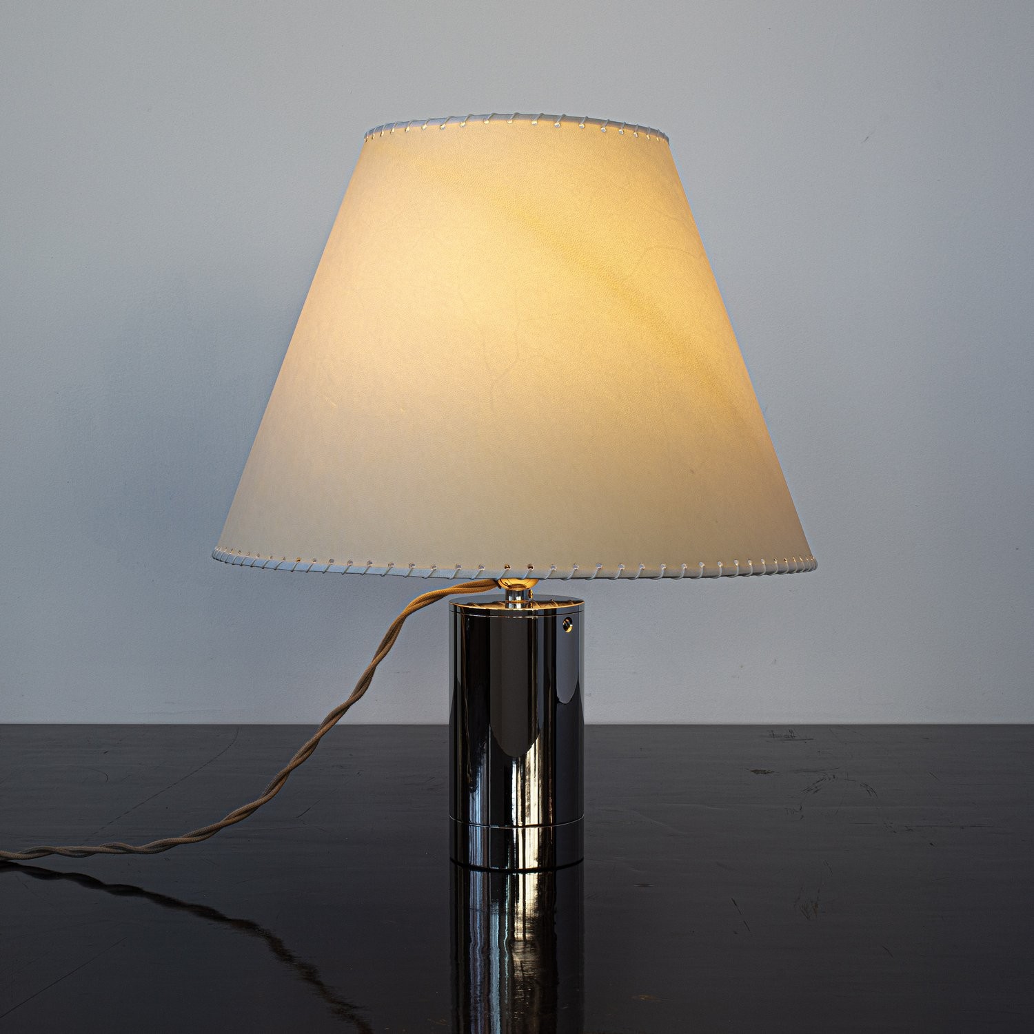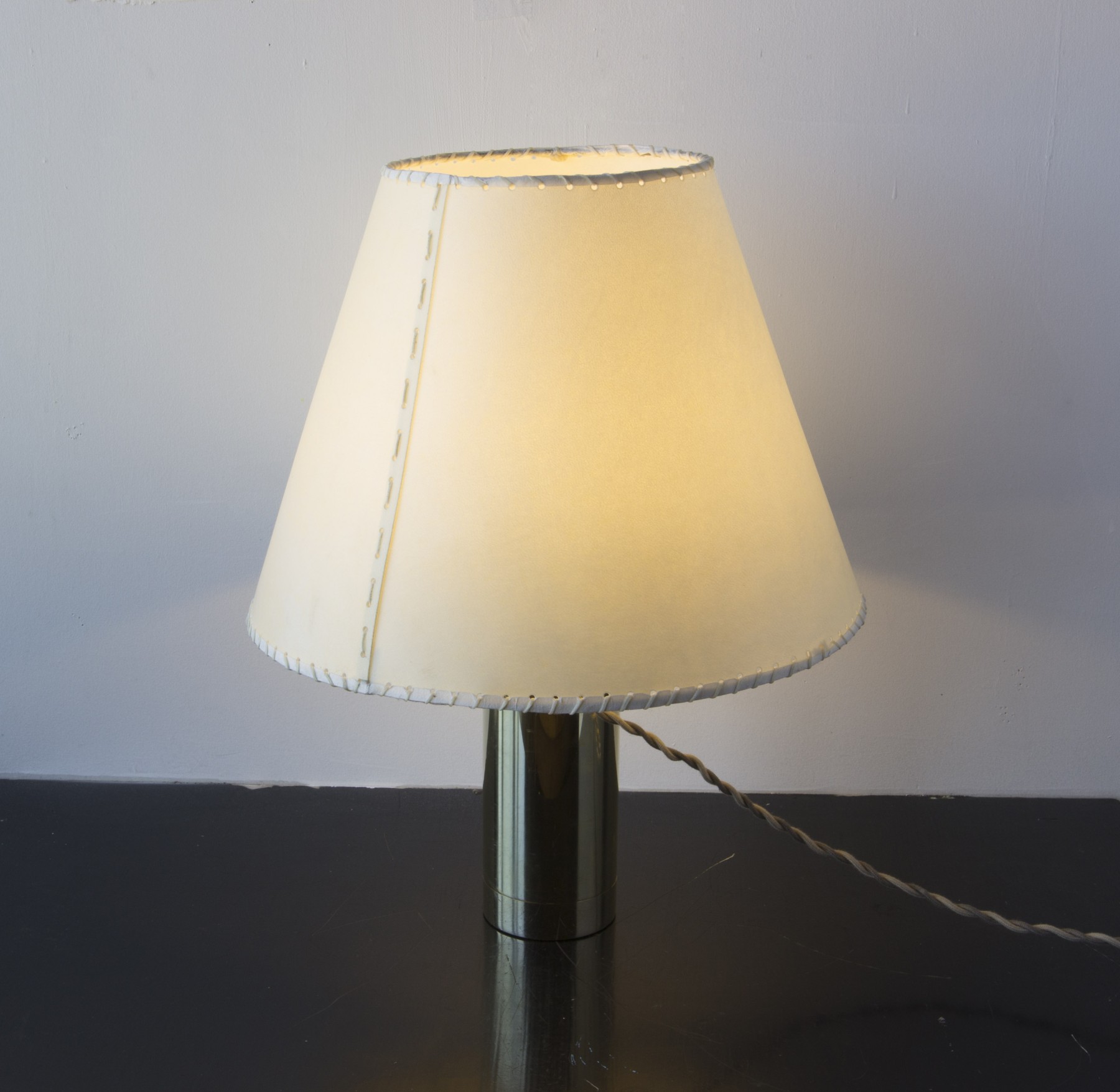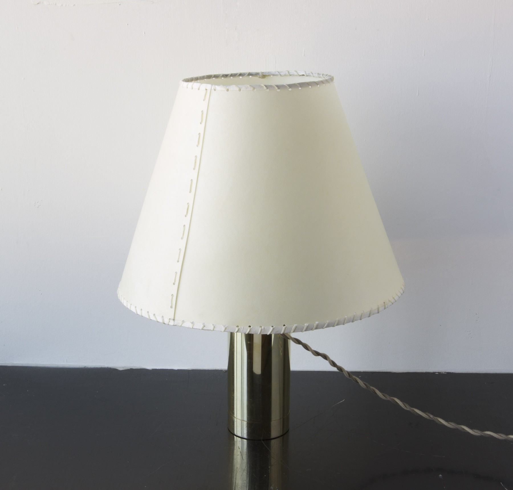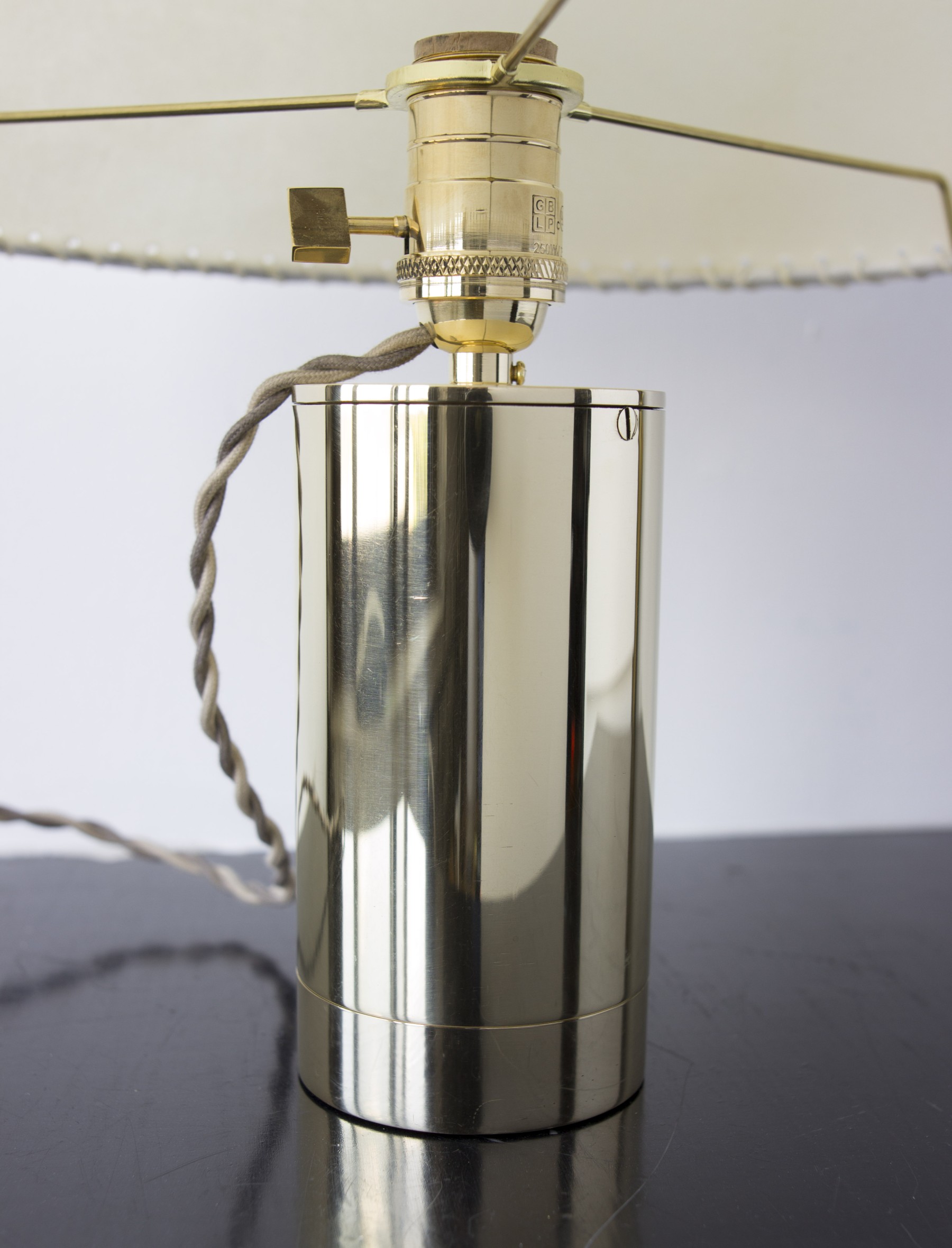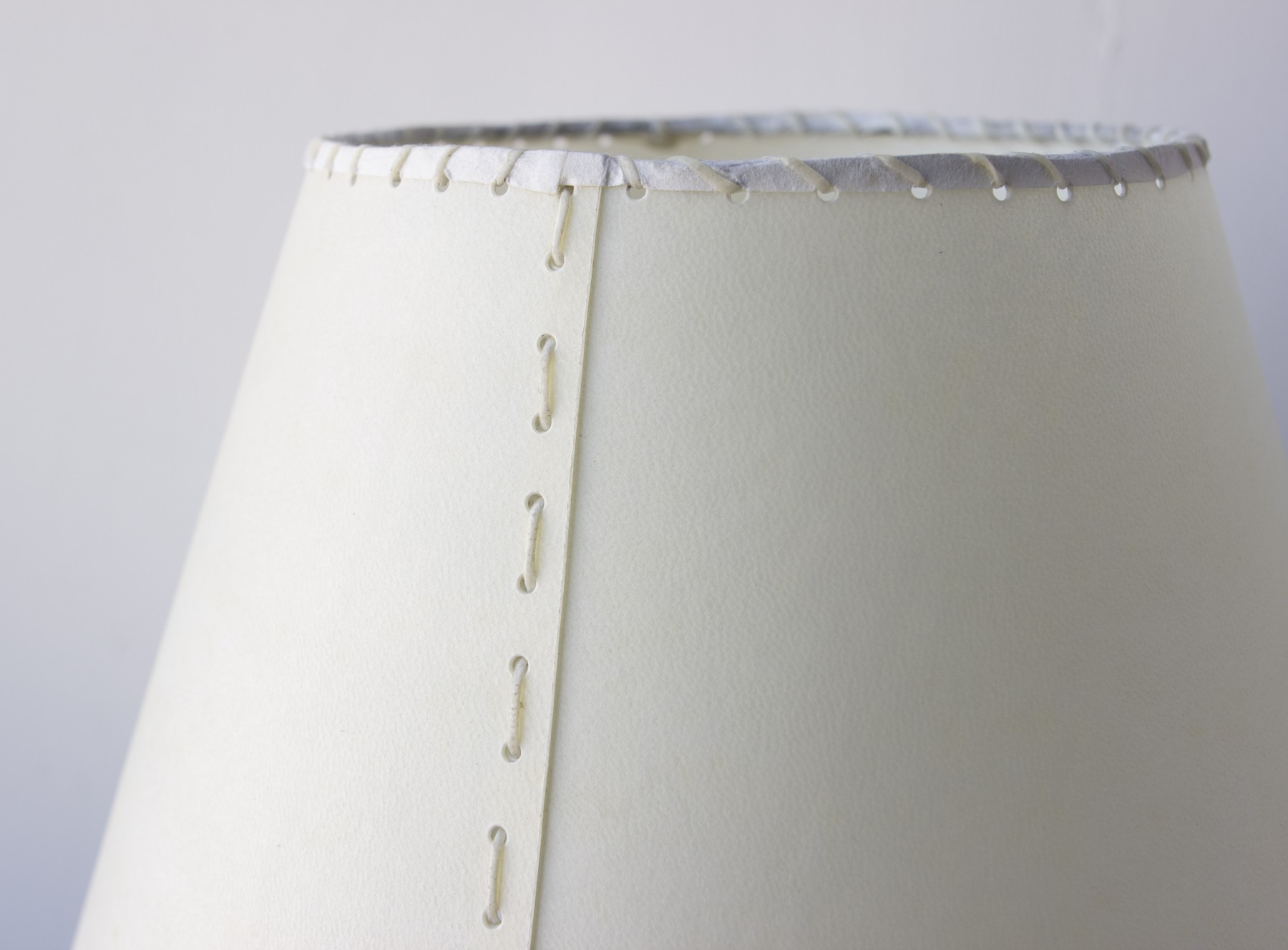 Solid machined polished unlacquered brass base, hand-stitched cream goatskin parchment shade, and hand-dyed braided cotton cord.