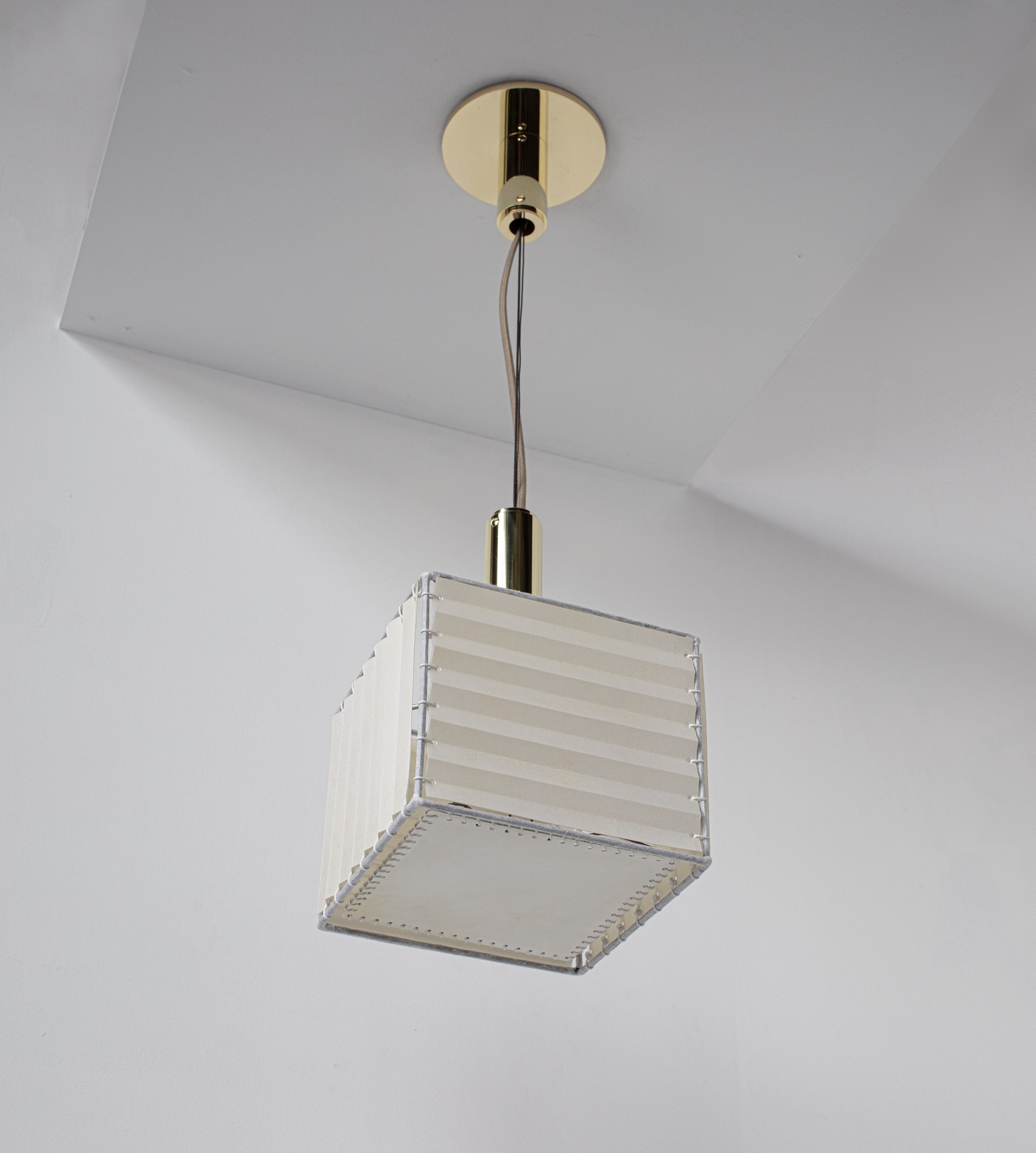 Solid machined brass, hand-stitched accordian folded goatskin parchment shade with diffuser. Goatskin parchment is an excellent diffuser of light and is naturally figured and textured, similar to the surface of the moon.