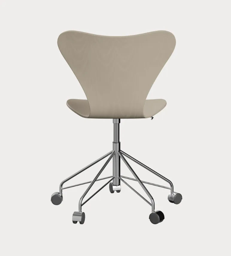 The Series 7™ chair is an icon in modern furniture history, designed by Arne Jacobsen in 1955. Its unique shape is timeless and incredibly versatile, displaying character without overpowering the eye. The chair is made from 9 layers of pressure moulded veneer for strength, flexibility and durability despite its slender form. This is the most popular design within Fritz Hansen’s chair collection. The height-adjustable 3117 swivel chair features an elevated five-legged steel base with high-quality aluminium capped castors, originally designed by Jørgen Rasmussen in 1965 for the KEVI chair. The castor’s twin-wheeled design improves manoeuvrability, and customers have a choice of hard or soft wheels that glide smoothly on a range of surfaces without damaging the floor.