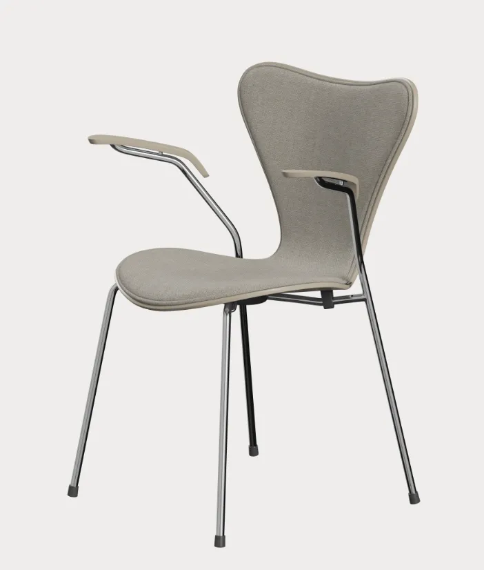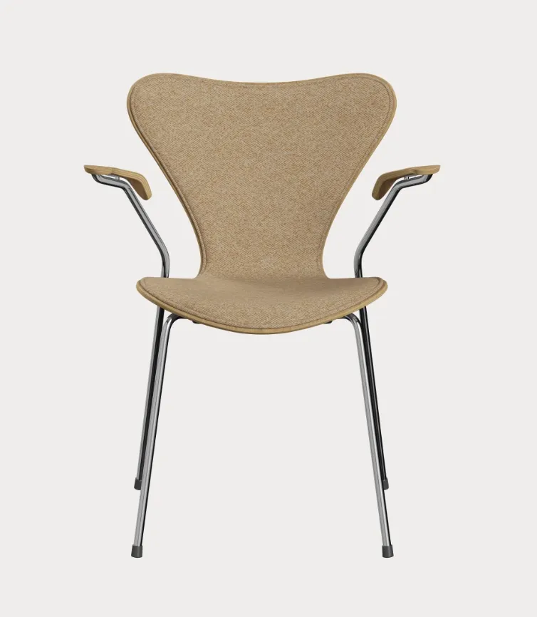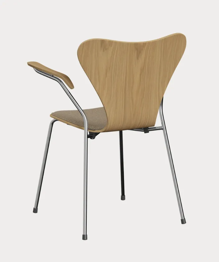 The original Series 7 chair is the 3207. It was launched in 1955 at the H55 international design exhibition in Sweden as Arne Jacobsen’s reply to the criticism he received for the Ant chair. The 3207 provided a striking response with perfectly proportioned armrests that follow the contours of the curved backrest while extending the smooth lines of the rear legs to create a perfectly balanced and supremely comfortable design.